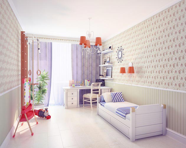 Es ist sehr wichtig für jedes Kind einen gemütlichen Raum und eine angenehme Atmosphäre zu schaffen, so dass das Kinderzimmer ein besonderer Platz im Haus ist. Da das Baby in seinem Zimmer nicht nur entspannen, sondern auch spielen, lernen, kreativ arbeiten, muss es in hellen Farben dekoriert und so viel wie möglich mit natürlichem Licht ausgestattet werden. Um Ihrem Kind mit dem originalen Interieur zu gefallen, genügt es, die Wände mit der kombinierten Tapete zu beenden. Bis heute gehören Tapeten zur beliebten Form im Design.