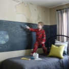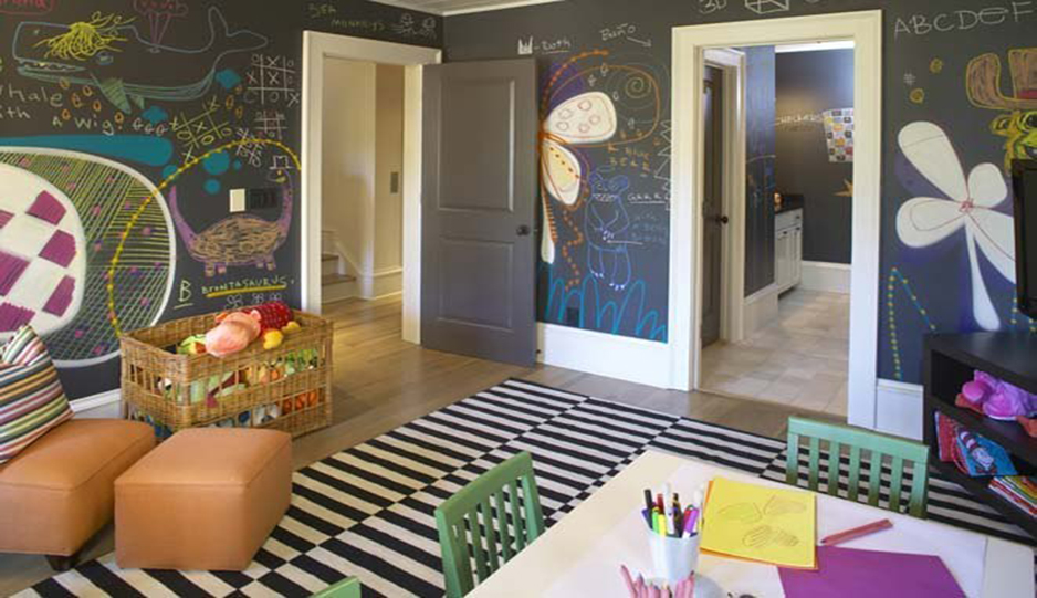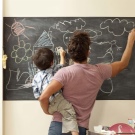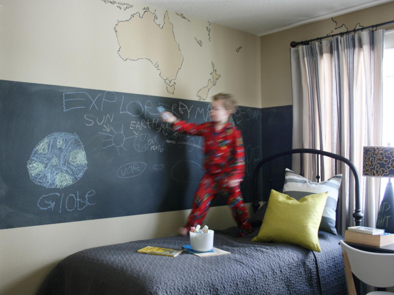 Im ersten Fall kann das Kind mit Buntstiften Fantasie zeigen. Die Farbe solcher Tapeten ist meist schwarz oder dunkelblau. Es ist natürlich nicht notwendig, alle Wände des Raumes in einem dunklen Ton zu kleben, manchmal reicht ein oder ein Teil davon aus. Also, von der Kreidetapete können Sie die echte Komposition in Form von Silhouetten von Schmetterlingen, Blumen, geometrischen Formen und mit viel Freude in verschiedenen Farben malen.