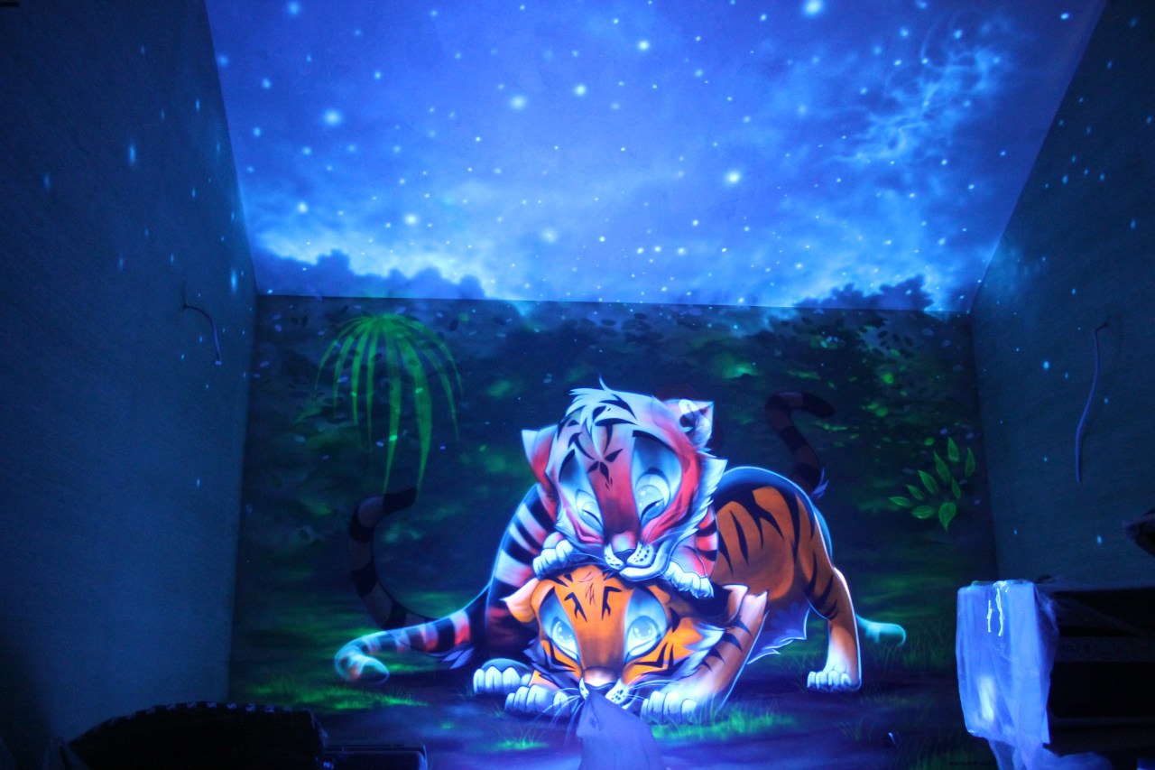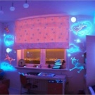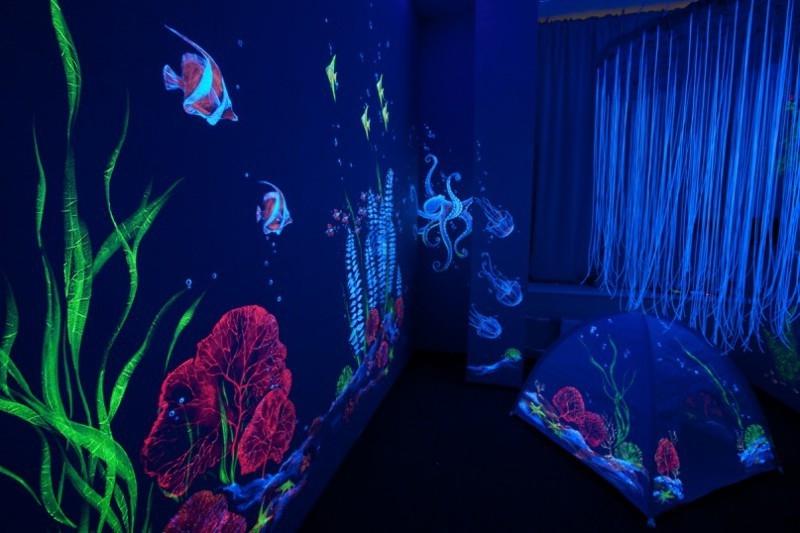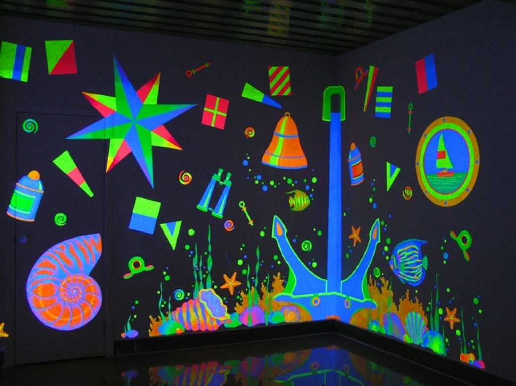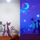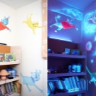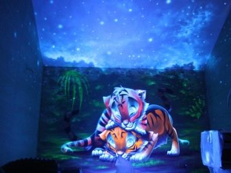 Die zweite Art von Gitter beginnt zu "arbeiten" dank einer UV-Lampe, die montiert wird, wenn die Tapete geklebt wird. Pigmente fluoreszierender Tapeten beginnen unter dem Einfluss einer Lampe zu leuchten und geben dem Raum ein außergewöhnliches Aussehen.