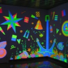 Volumetrische 3D-Hintergrundbilder im Weltraumthema werden durch hellviolette Tapeten für die produktiven Aktivitäten der Schüler an Wänden und Decke ergänzt.