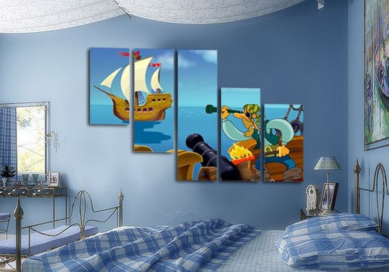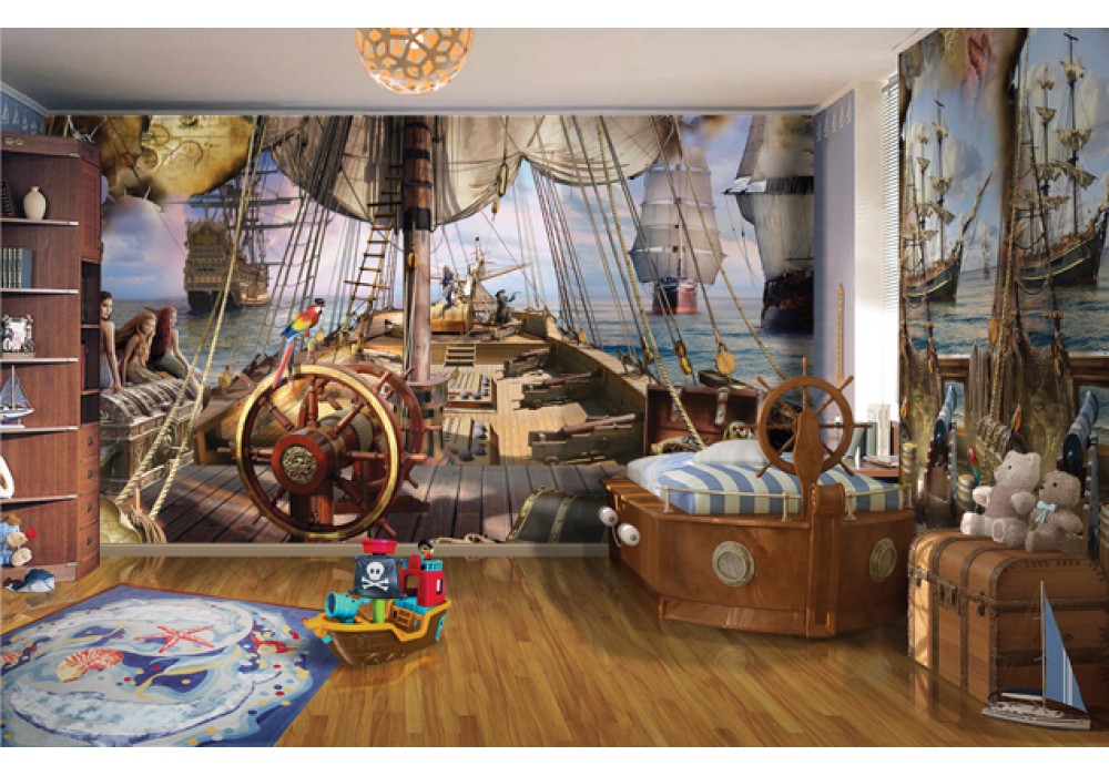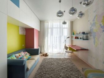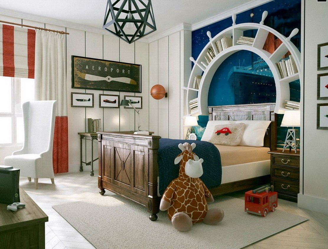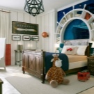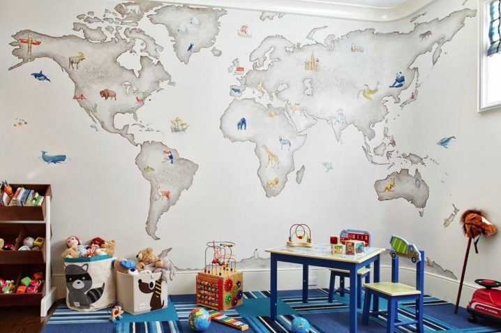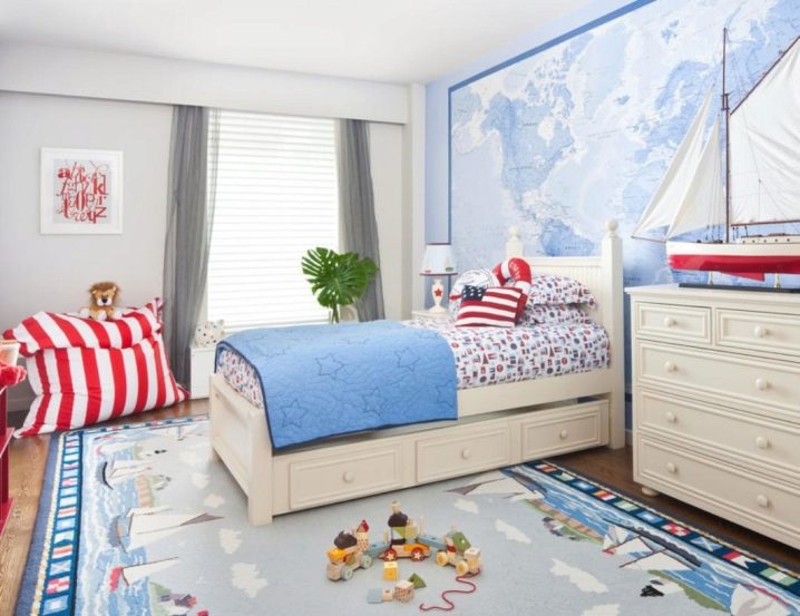 Und wenn die Mädchen im Kinderzimmer sich wohl und ruhig fühlen sollen, dann braucht die Seele der Jungs ständig Entdeckungen und Spiele. Zu diesem Anlass haben die Designer eine Tapete im maritimen Stil vorbereitet. Für den Schüler wird eine Fototapete oder ein Panel mit einer Karte der Welt oder des Kontinents eine nützliche und stilvolle Lösung sein.