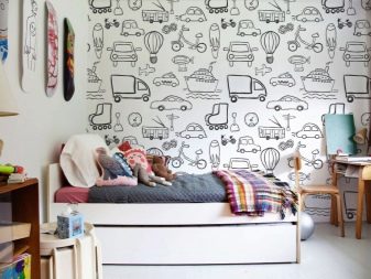 Es ist schwierig, einen Jungen zu finden, der die Karikatur "Cars" nicht mindestens einmal gesehen hat. Unnötig zu sagen, aber für viele Zappeln wurden sie echte Favoriten, was bedeutet, dass es Zeit ist, den jungen Fan zu überraschen. Kleine bunte Drawing Schubkarren sieht gut an einer der Wände, wenn andere in einer einfarbigen Version hergestellt werden. Besonders beliebt sind Tapeten und Panels mit bunten Autos.