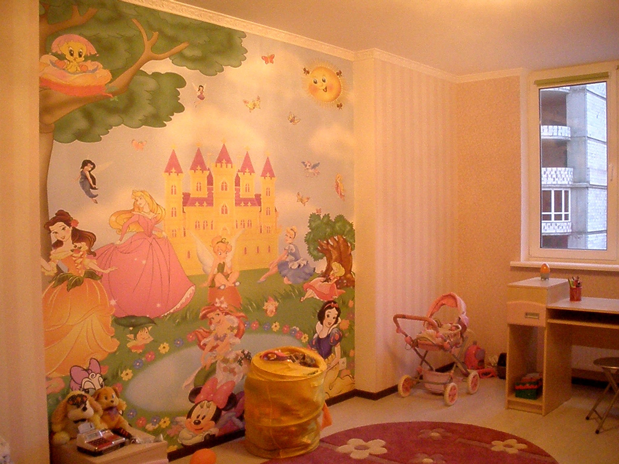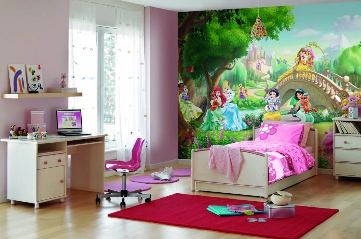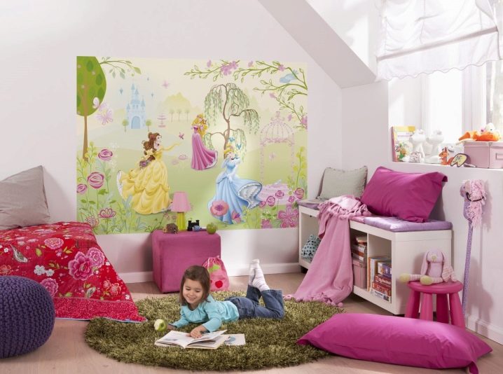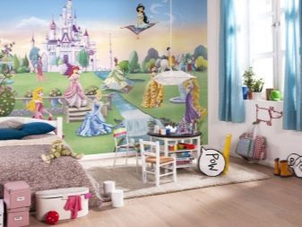 Fortsetzung des Themas eines Versprechens des Mädchens, stehen klar Tapeten und Platten mit Disney Prinzessinnen, weil sie so gern Mädchen sind. Hier finden Sie schöne und Jasmin von Aladdin, blonde Schönheit Aschenputtel, Schneewittchen und die unglaubliche Schönheit der Karikatur „Die Schöne und das Biest.“Solch eine Komposition in Blau und Pink ist definitiv eine separate Wand im Kinderzimmer wert.