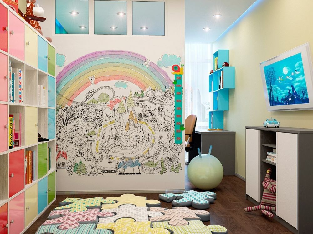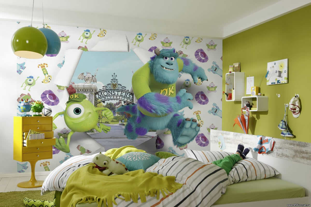Interessant im Kinderzimmer schauen Fototapete auf selbstklebender Basis.Aufgrund der Abwesenheit von Klebstoff mit der Dekoration einer der Wände kann sogar ein Teenager umgehen. Lieblingssterne, Landschaften, Abstraktionen - all das findet man heute in den Regalen und im Internet.