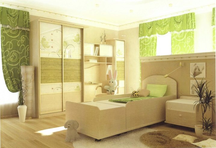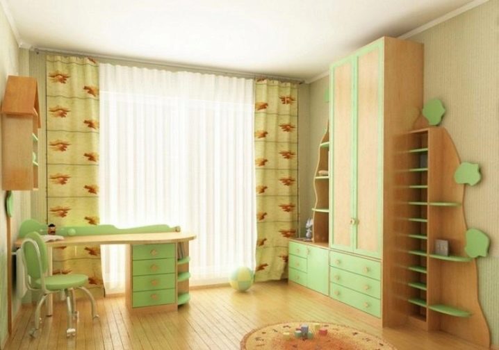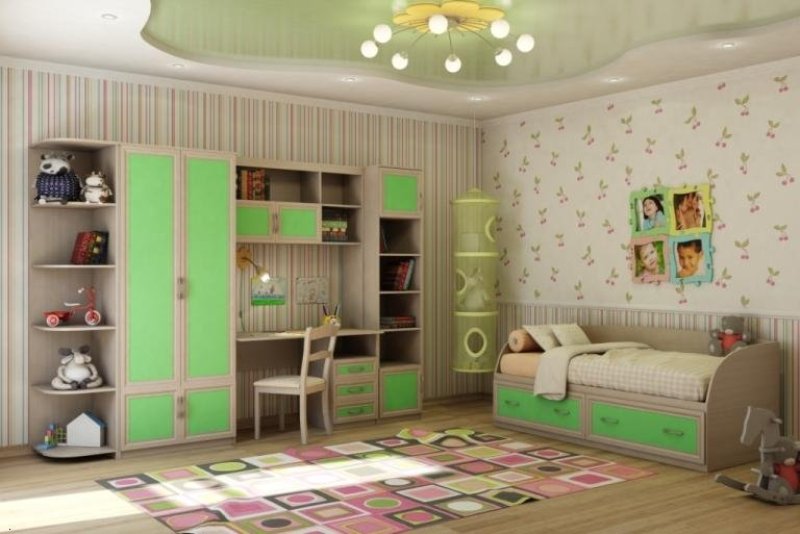 Apropos Rest des Wanddesigns, grüne Tapete sticht hervor. Hellgrüne und gedämpfte, aber immer helle Farben, verbessern sie den mentalen Zustand des Kindes und werden mit Pflanzen- und Tierdesigns kombiniert.