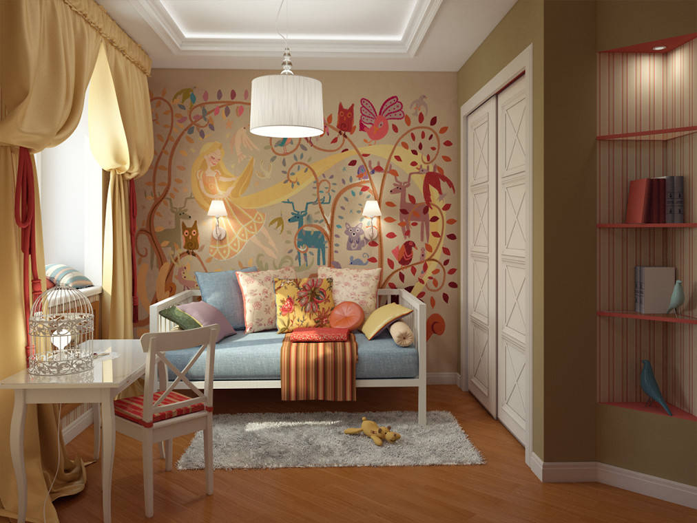 Eine weitere beliebte Option - fabelhafte Motive. Bei der Auswahl der Kinder ist es jedoch wichtig zu verstehen, dass die Vorlieben der Kinder flüchtig sind und dass das Investieren ernsthafter Mittel in ein solches Design manchmal nicht gerechtfertigt ist.