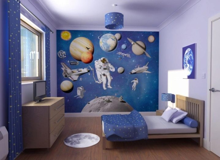 Eine universelle Version des Stils wird das Thema Raum sein. Sterne und Planeten, die auf der Tapete abgebildet sind, werden Aufmerksamkeit erregen. Die beste Option sind leuchtende Modelle.
