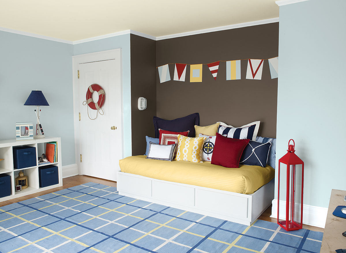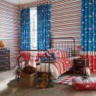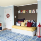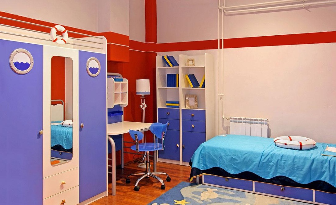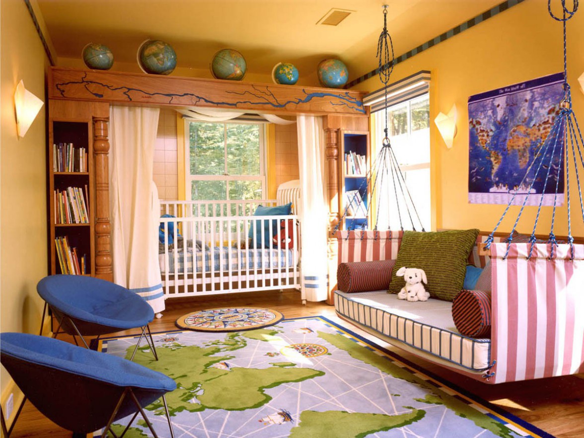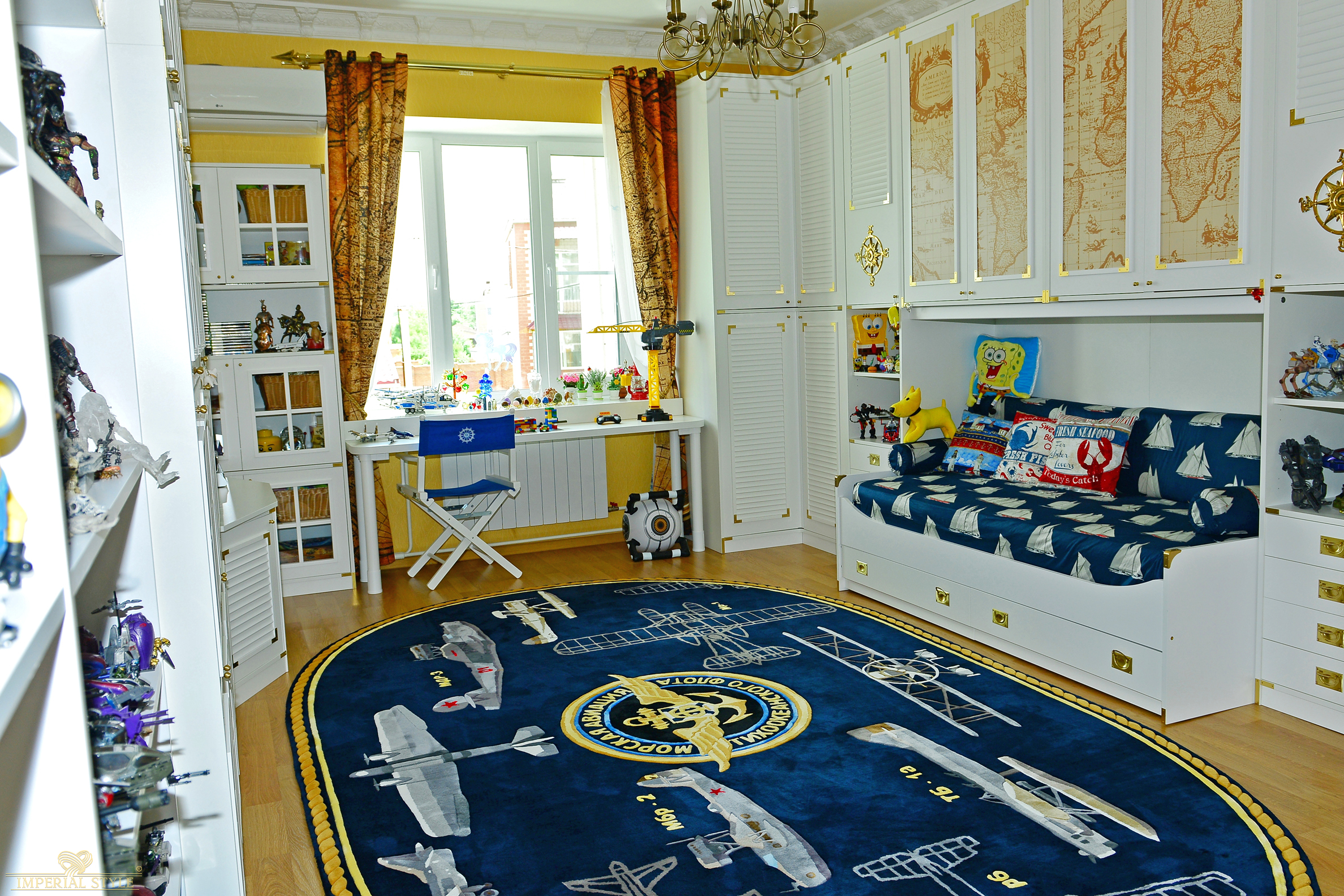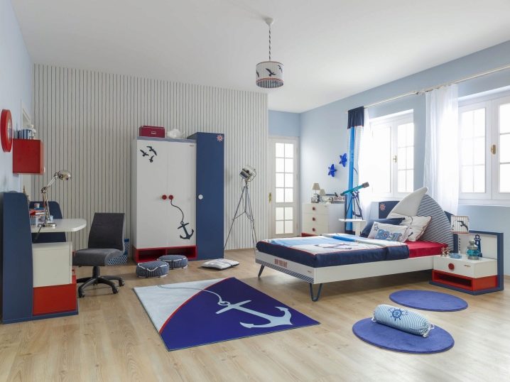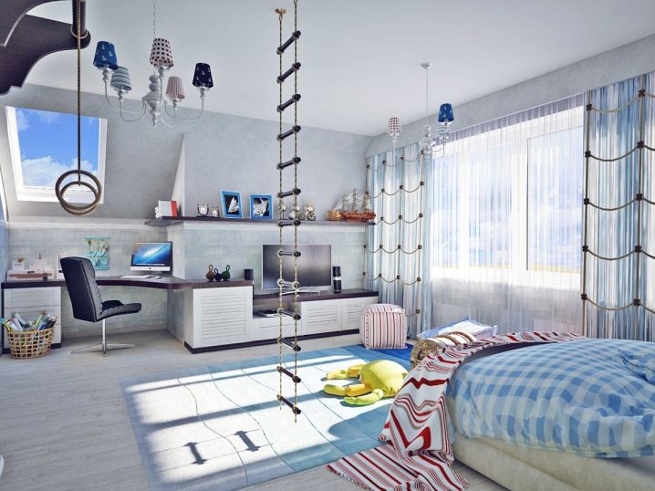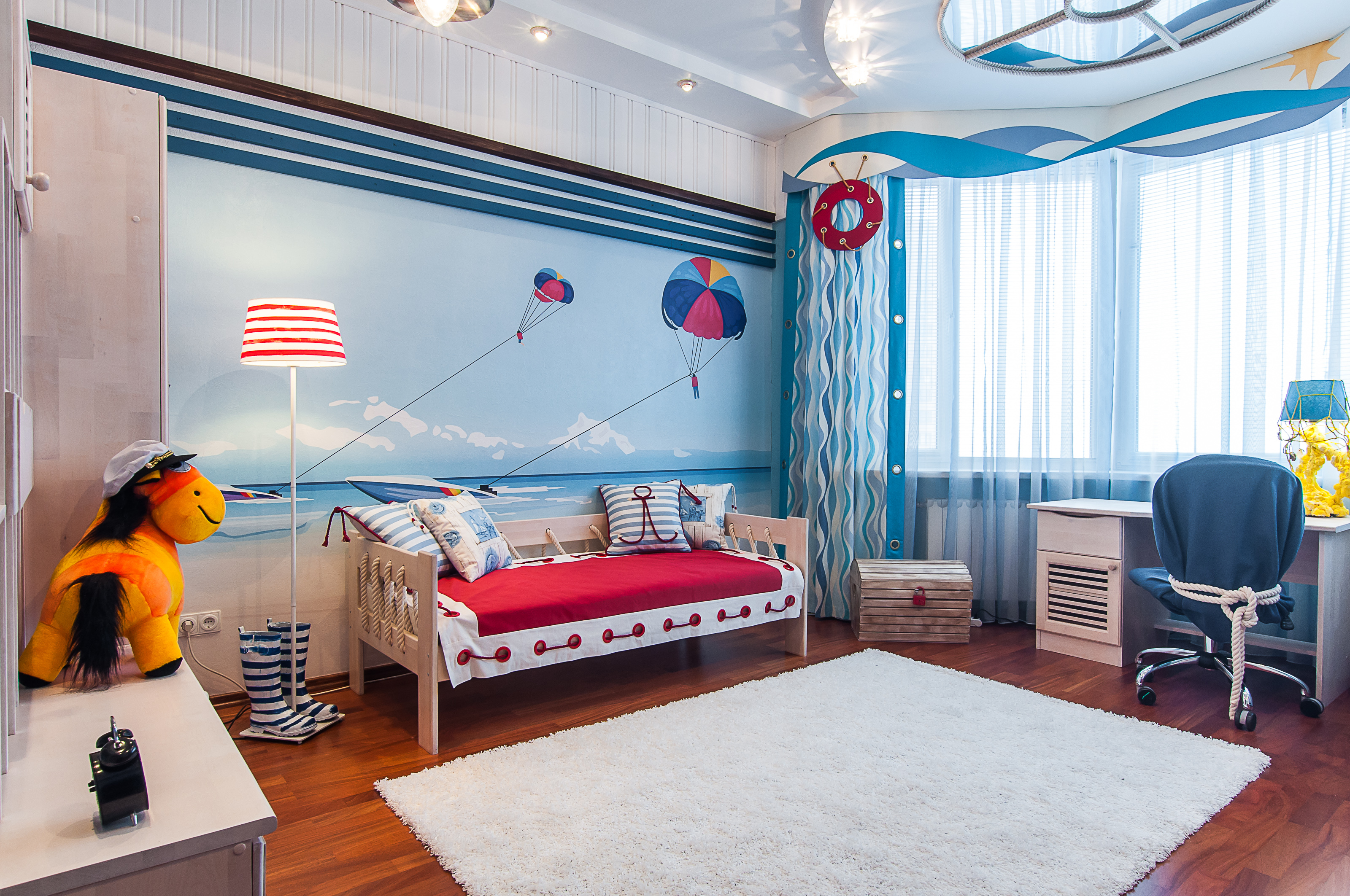 Wenn Sie aus ungewöhnlichen geometrischen Formen wählen, kann der Teppich die Form eines Piratenschiffes haben, kann es durch das Lenkrad, den Anker und den Mast dargestellt werden. Es ist wichtig daran zu denken, dass, um eine authentische Atmosphäre in der Baumschule zu schaffen, Sie die passende Tapete kaufen müssen, verwenden Sie themenbezogene Gemälde und Vorhänge, fügen Sie Raumelemente wie Bullaugen und Seile hinzu.