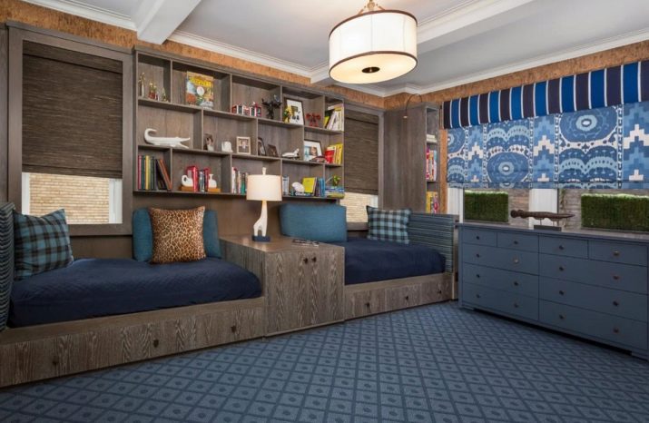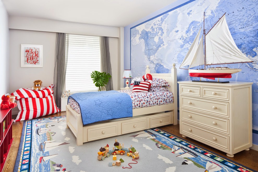 Wenn die Vorlieben des Jungen nicht zu offensichtlich sind, verwenden Eltern in der Regel blau-blaue Farben, um den Raum zu dekorieren und ihn im nautischen Stil zu dekorieren, was ziemlich universell ist. Um das marine Thema zu ergänzen, gibt es viele Teppiche. Sie können mit dem Bild des Meereslebens sein.