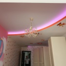 - Hintergrundbeleuchtung. Um die Beleuchtung zu installieren, wird ein Stahlreifen an der Betondecke installiert. Das Design ist so fixiert, dass das Regal erscheint. Beleuchtungseinrichtungen wie LED-Lampen sind darin installiert.