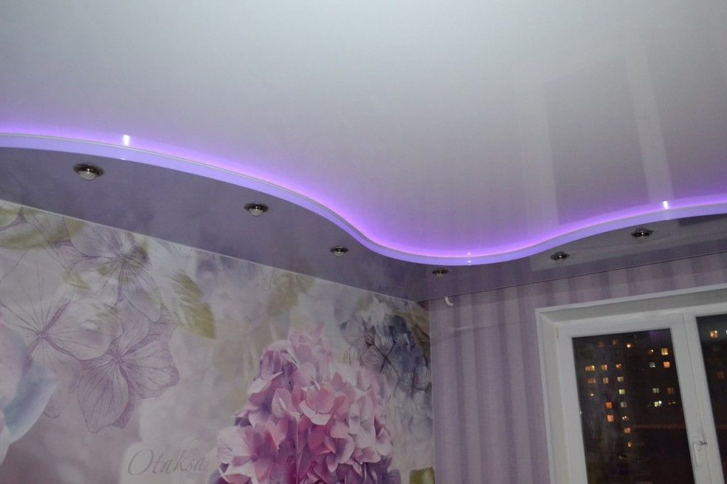 Für das Design einer abgehängten Decke können Sie die Hintergrundbeleuchtung verwenden. Es hilft, die Wirkung einer zweistufigen Obergrenze zu verbessern.
