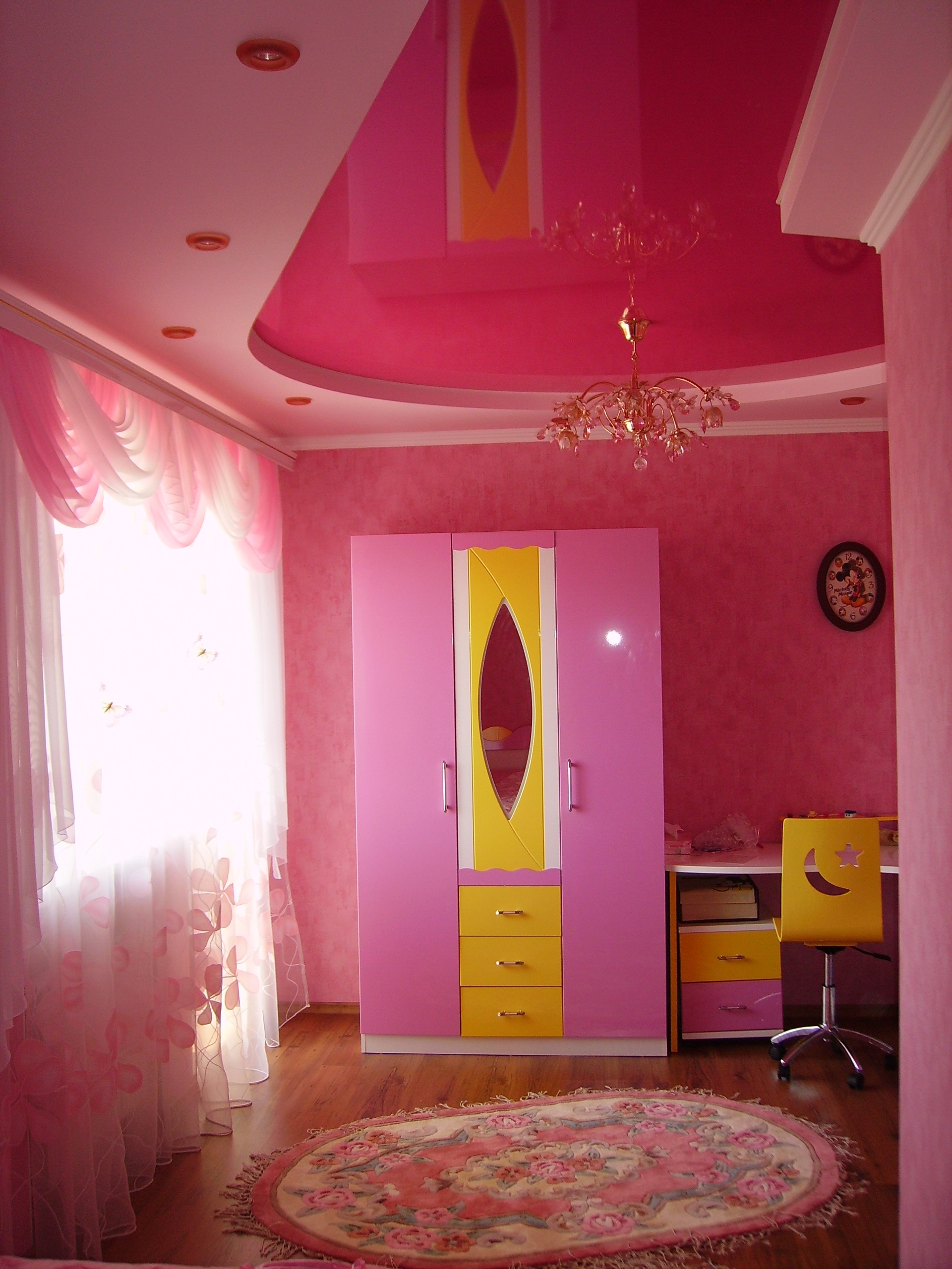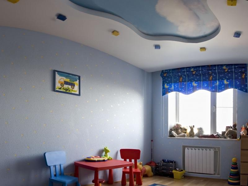 Wenn das Kinderzimmer groß ist, kann die Decke über dem Spielfeld in satten Farben gehalten werden. In diesem Fall sollte der Ruhebereich in ruhigen Farben angeordnet sein.
