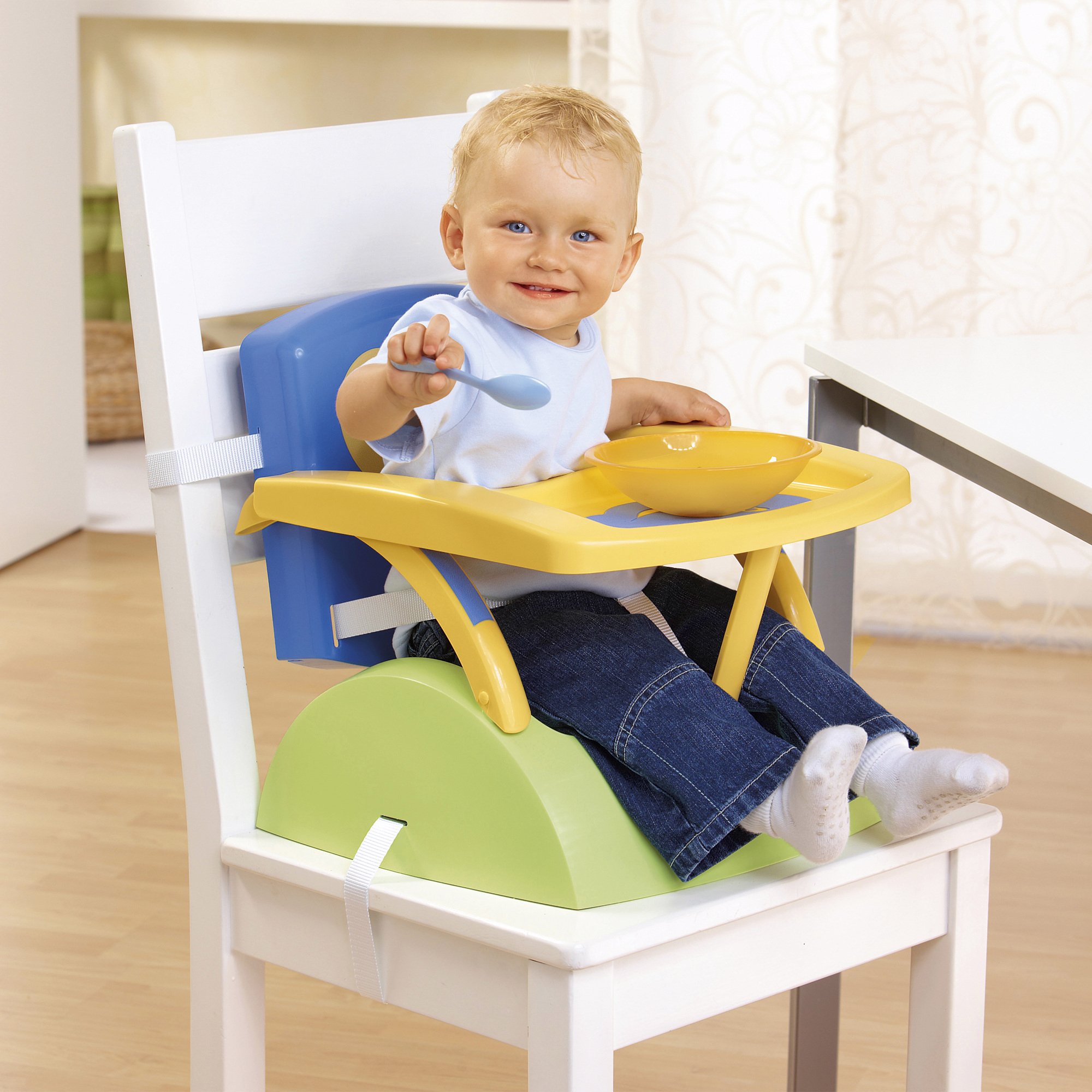 - die erste Position ist ein hoher Fütterungsstuhl, der zum Tisch der Eltern bewegt wird;