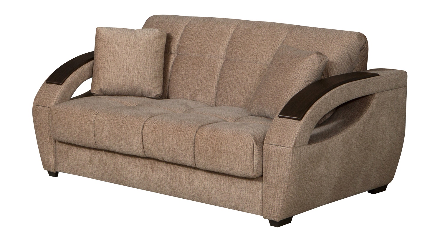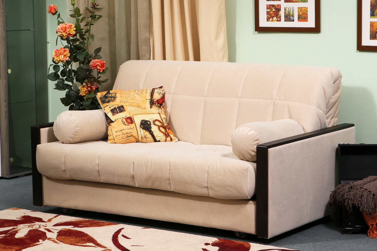 Eines der beliebtesten und preisgünstigsten Polstermöbelmodelle ist ein Sofa. "Baron". Sie können nur 18 Tausend Rubel treffen - und kaufen Sie ein schönes Sofa von guter Qualität, resistent gegen Verschmutzung, mit hoher Verschleißfestigkeit. Dies ist ein kleines Modell, aber sehr gemütlich. Es wird jedes Wohnzimmer schmücken, es wird sein Highlight sein. Als Polsterung verwendete man ein weiches, weiches Stoffmaterial, Sandtönung. Die Armlehnen und der Boden sind aus sattem dunkelbraunem Kunstleder gefertigt. Der Füllstoff ist sehr hochwertig - Polyurethanschaum. Umwandlungsmechanismus - "Akkordeon". Im Inneren des Sofas ist ein Metallrahmen.