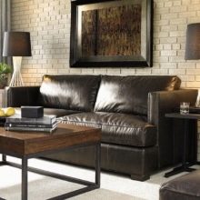Luxuriöse Ledermöbel sind sehr schön in Kombination mit dekorativen Wänden (zum Beispiel mit Ziegeln).