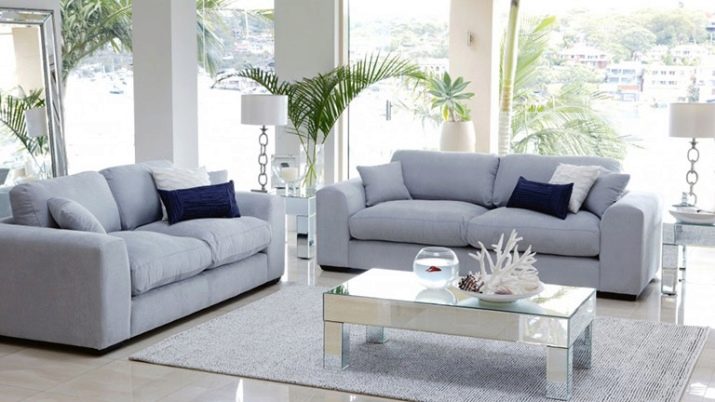 Moderne Trends in der Möbelmode bieten eine inkompatible Kombination von Experimenten: Sie können versuchen, ein Sofa und Stühle aus verschiedenen Sets zu kombinieren, die sich in Form, Farbe und Polsterung unterscheiden. Als Option eine Kombination aus einem Stuhl mit Veloursbezug und einem Ledersofa.