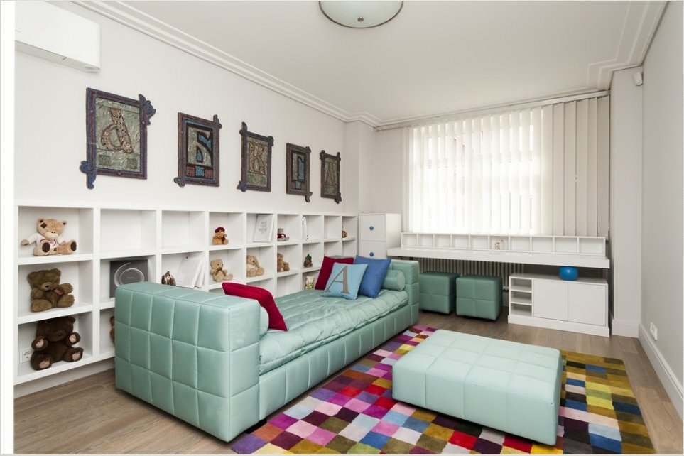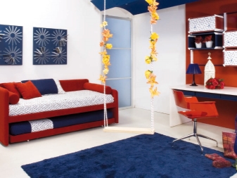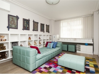 In den Kinderzimmern wurden große Sofas verwendet. Dies ist eine durchdachte Option für die Zukunft, für das Wachstum eines Kindes. Designer sagen, dass ein Sofa viel bequemer und praktischer ist als ein Bett. Darüber hinaus vereint ein Möbelstück zwei: ein Sofa und ein Bett. Polstermöbel im Kinderzimmer sind in der Regel mit Teppichen, Kissen und anderen textilen Accessoires ausgestattet.