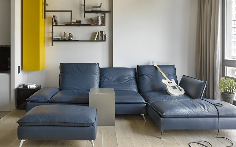 Wenn das Zimmer in satten und kräftigen Farben dekoriert ist, ist eine lila oder blaue Polsterung ideal. Für lakonische minimalistische Designs empfiehlt es sich, ein Sofa in grauen Farben zu wählen. Modelle in Braun- und Beigetönen sind sehr gefragt.