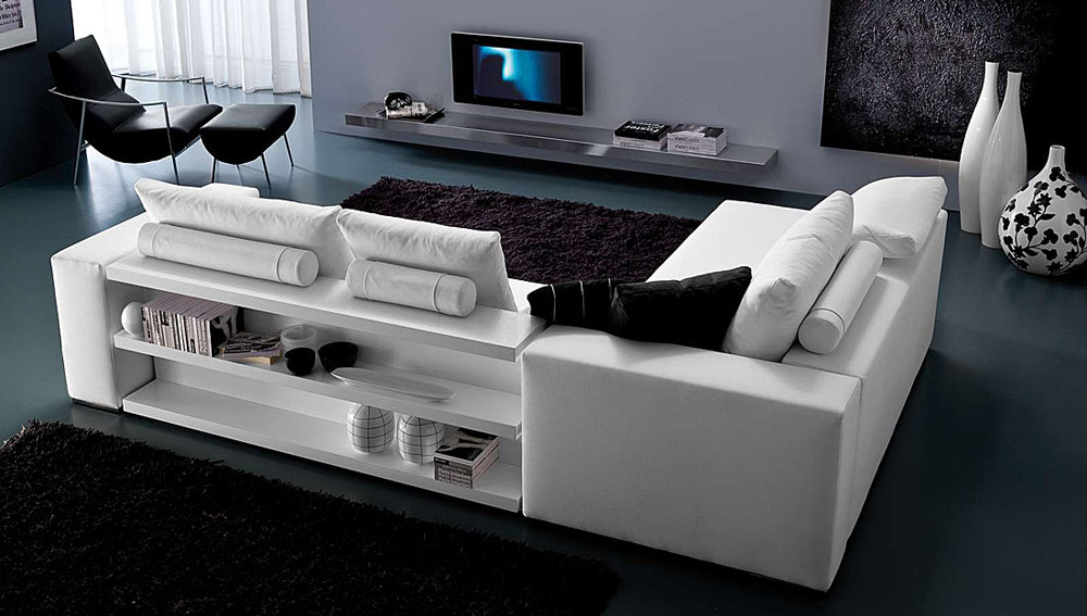 - Die Fähigkeit, das Sofa als Bett zu benutzen, das Vorhandensein von zusätzlichen Regalen und sogar Schiebetischen.