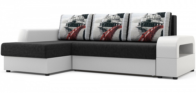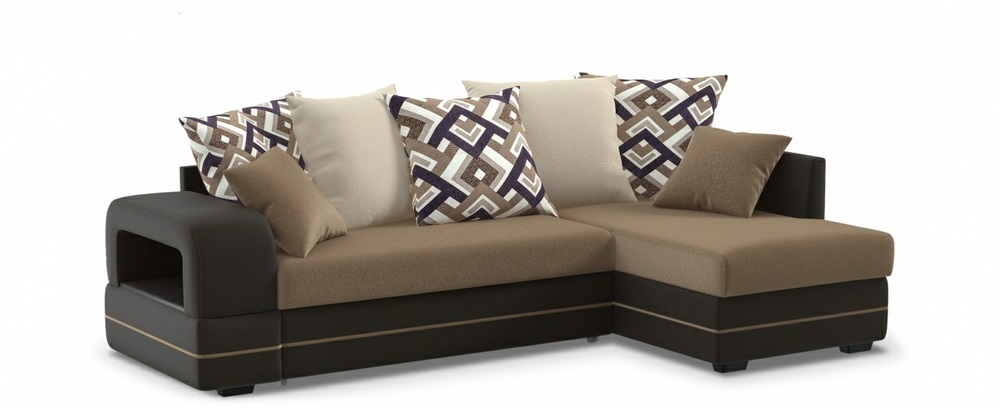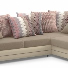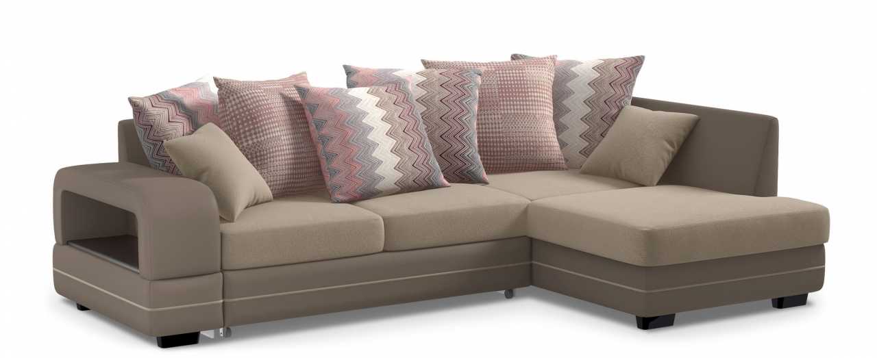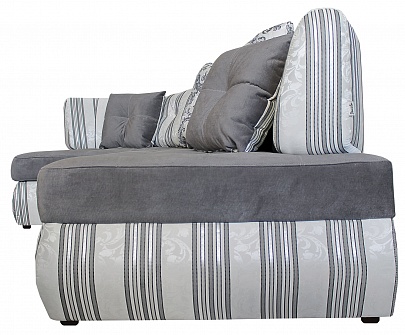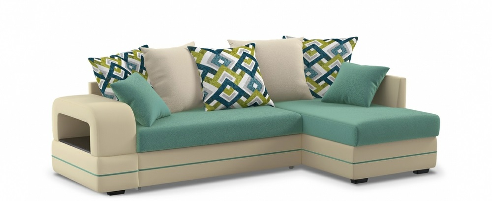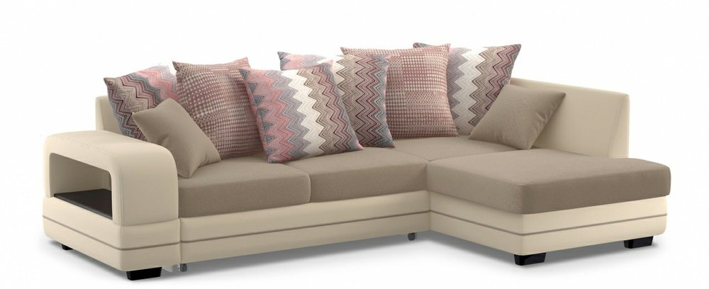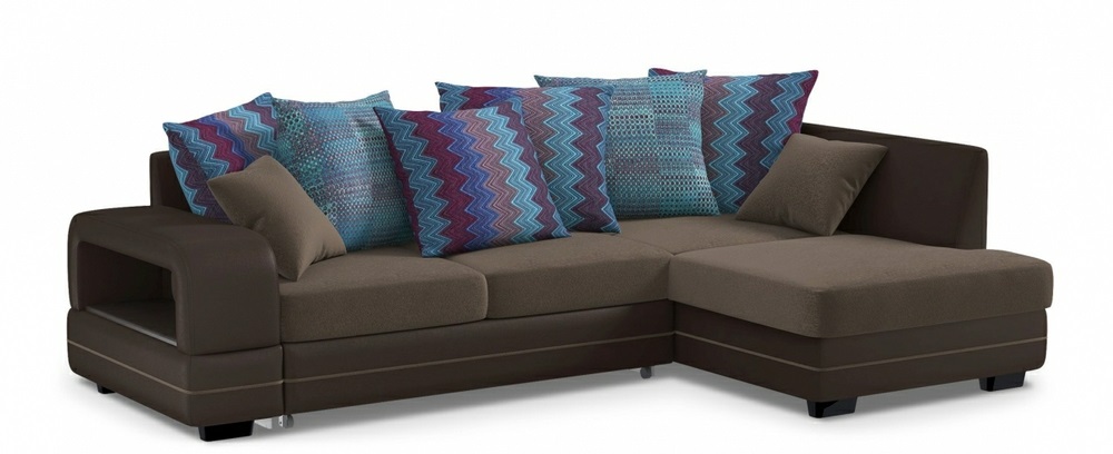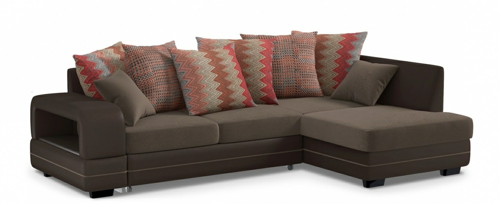 Sofa "Dubai - Nächste 030"Von der Firma"Shatura"Ausgestattet mit einem Mechanismus" Dolphin ", und der daraus resultierende Schläfer erfreut beeindruckende Dimensionen 2188x1440 mm. Verschiedene Arten von Stoffen sind an der Dekoration beteiligt: gemusterter Jacquard auf zahlreichen Kissen, Velours auf dem Sitz, und der Boden, Rücken und Armlehnen sind aus praktischem Öko-Leder. Darüber hinaus lassen sich die breiten Armlehnen als Tischplatten nutzen: bequem auf den harten, ebenen Boden zu lehnen oder etwas zu stellen, und Bücher und Zeitschriften können in die Armlehnennische gestellt werden. Bei der Bestellung können Sie das Modell für die Einstellung des linken oder rechten Winkels auswählen.