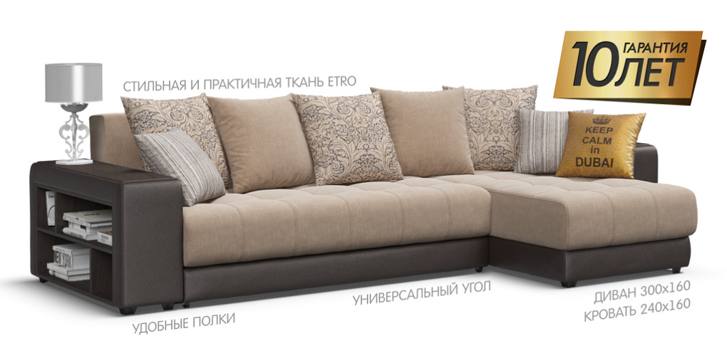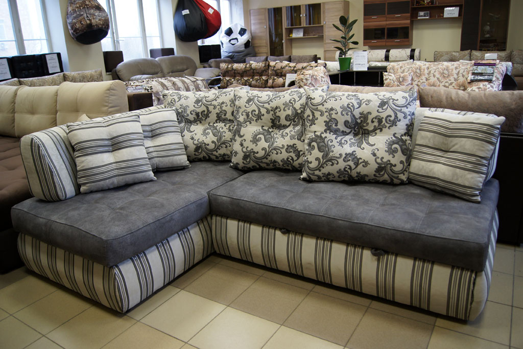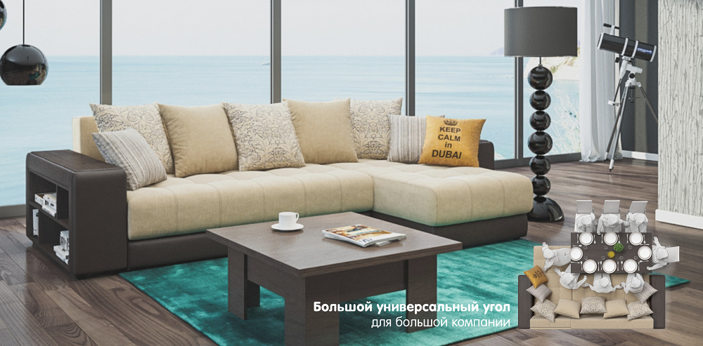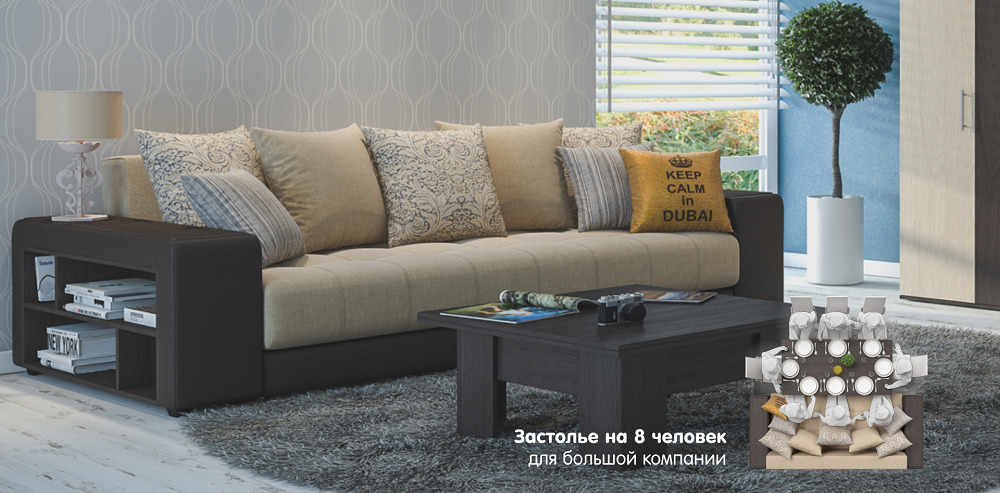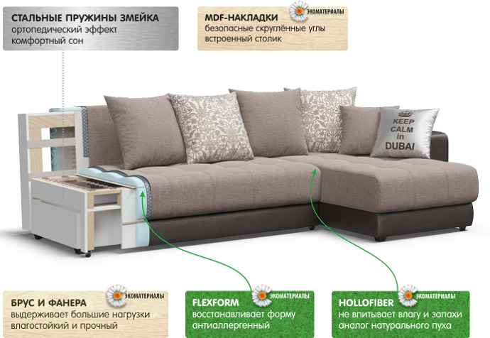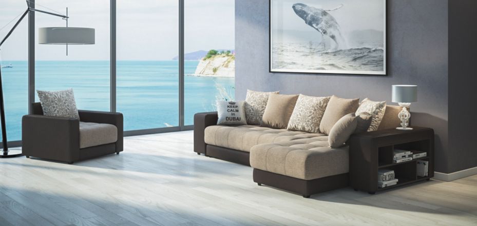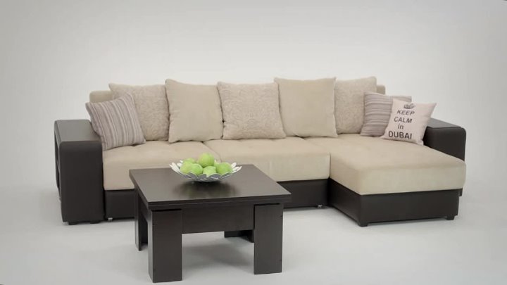 Modellsofa namens "Dubai"Gefunden im Bereich vieler russischer Hersteller von Polstermöbeln. Das Produkt wird in einer breiten Preisspanne präsentiert: von einem kleinen, geraden Modell der Economy Class bis hin zu einem geräumigen, modularen Sofa mit exklusivem Bezugsstoff und Lederausstattung.