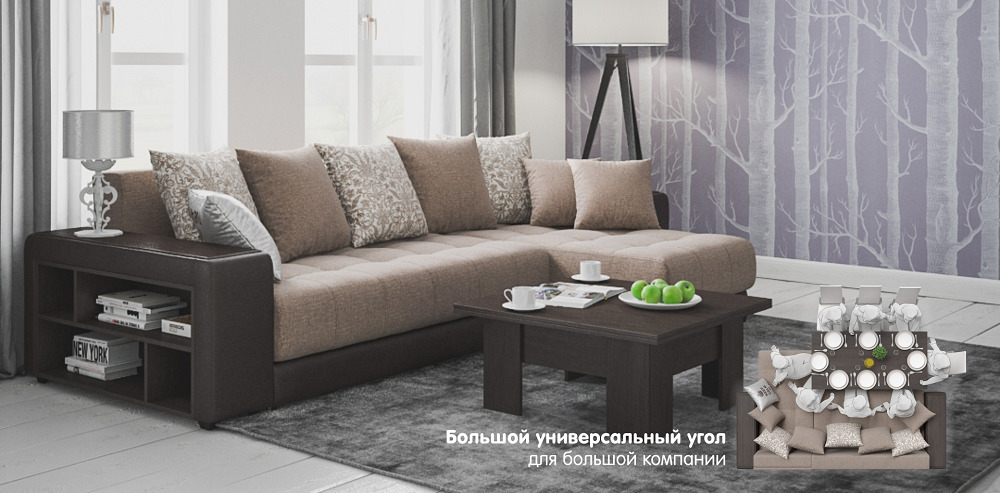 Die Ecke des Sofas ist universell - Sie können ein Modell mit seiner linken und rechten Position wählen und dann während des Betriebs die Zusammensetzung ohne die Hilfe von Spezialisten ändern. Das ist ziemlich einfach, aber dadurch können Sie einen völlig neuen Raum bekommen und das lästige Innere wieder aufbauen.