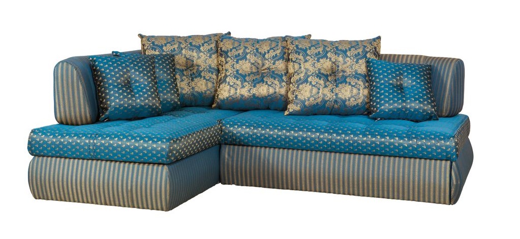 Eckiges hübsches Sofa "Dubai" von der Fabrik "Disavi»Hergestellt in einem klassischen Stil. Der Katalog präsentiert verschiedene Polsterlösungen. Es ist besonders gut in Jacquard-Gewebe von Blau und Gold. Eine interessante Kombination aus großen Mustern floraler Ornamente auf Kissen, kleiner Füllung auf dem Sitz und einem dünnen goldenen Streifen an der Basis des Sofas. Die Couch verwendet den "Venice" Transformationsmechanismus, bei dem der Schlafblock auf Rollen nach vorne geschoben wird und durch die Schlaufen aufsteigt, um eine ebene Fläche zum Ausruhen zu bilden.