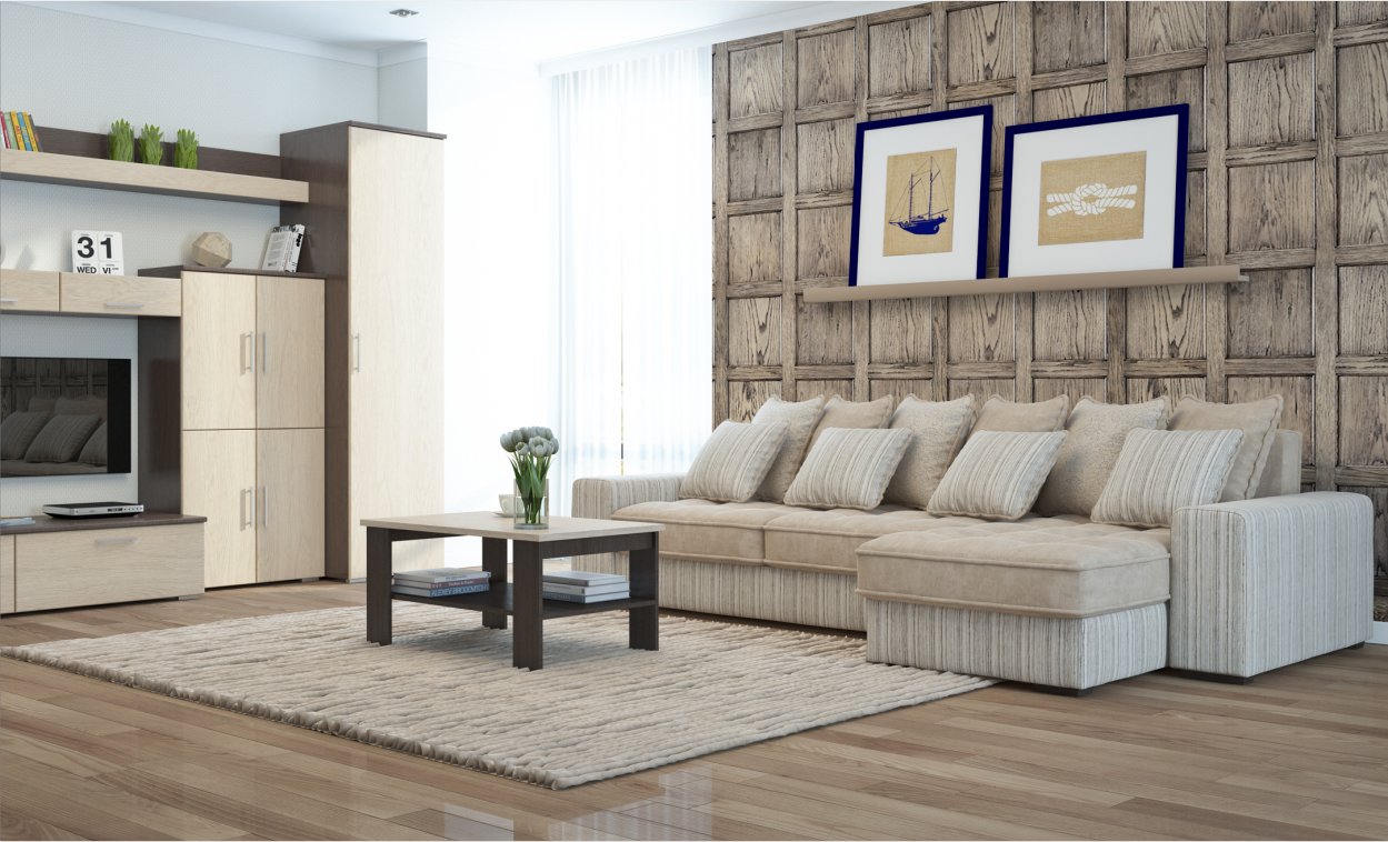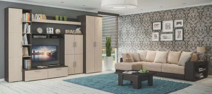 Für das eckige Modell sieht es interessant aus, wenn eine Seite an die Wand angrenzt und die andere quer durch den Raum. Es entsteht eine Art gemütliche Halbinsel, die mit einem Couchtisch, einem Sessel oder einem Hocker ergänzt werden kann, und in dieser Zone kann ein Teppich auf den Boden gelegt werden.