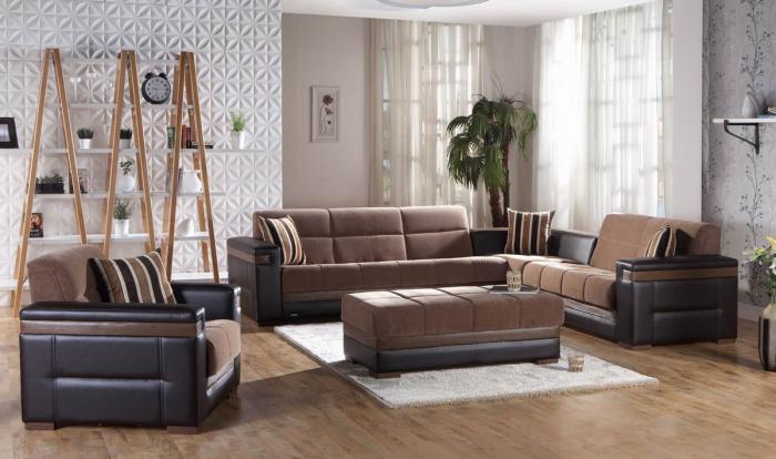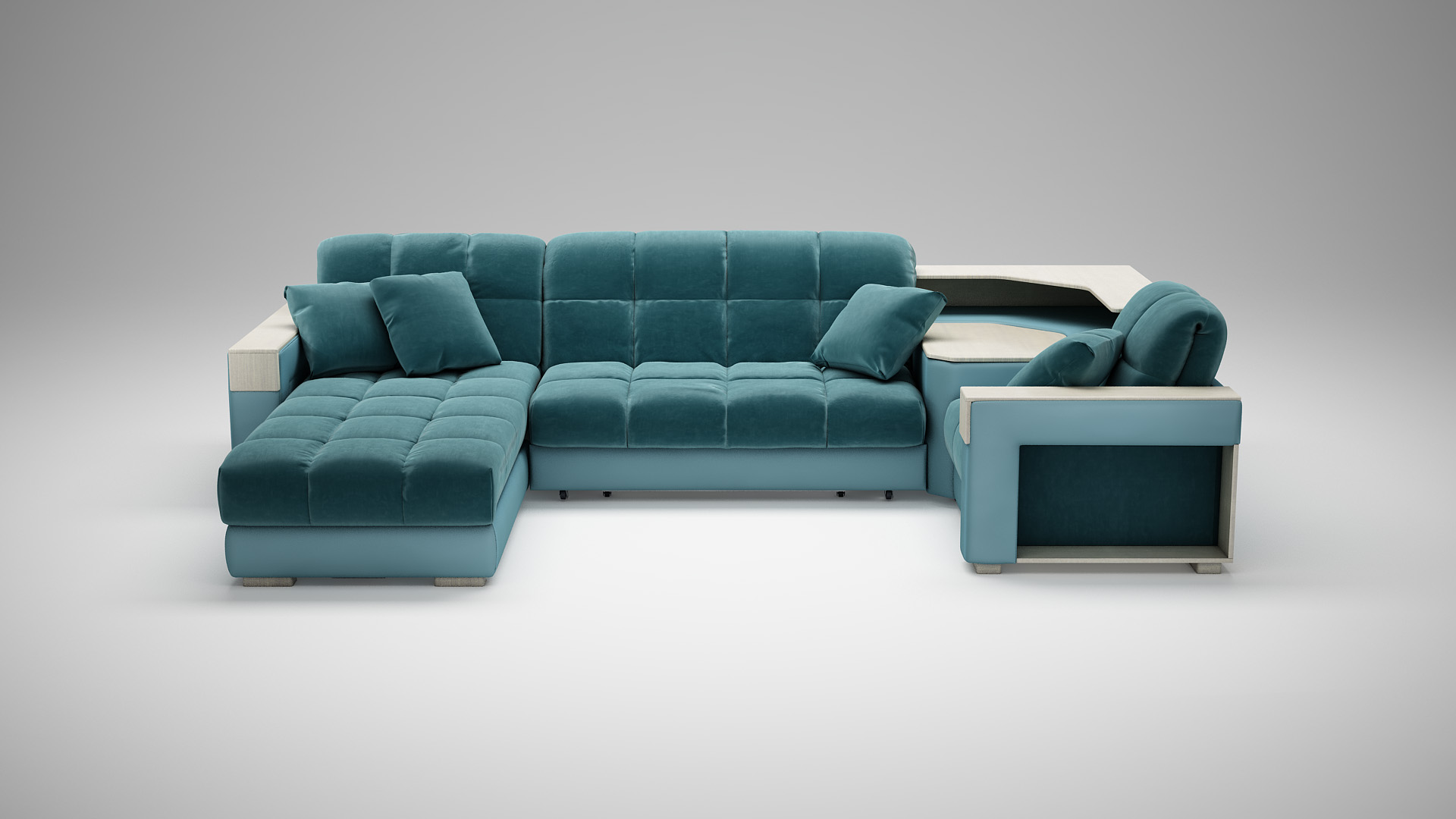 - Ecksofa 008 - Es ist ein modulares transformierendes Sofa, das sich wie ein Buch entfaltet. Dieses Modell besteht aus sieben Teilen, von denen jeder sein eigenes, einzigartiges Trennelement hat: ein Regal, eine kleine Bank, eine gewöhnliche Bank und eine klassische weiche Armlehne. Sie alle erfüllen die Funktionen der Armaufteilung. Der weiche und zugleich langlebige Rahmen von Sitz und Rücken bietet maximalen Komfort. Der Mechanismus des Faltens des Sofas ist einfach und haltbar.