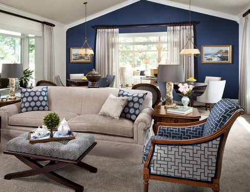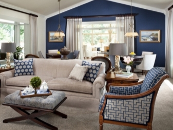 Um ein Win-Win-Set aus verschiedenen Möbelstücken herzustellen, sollten die Farben des Ornaments die Farben eines einfarbigen Objekts wiederholen. Es muss nicht sehr auffällig sein.Sie können die Farbe des Musters mit einem anderen Grundton wählen, aber kleine Details sollten sich immer noch mit einem Hinweis auf ein anderes Möbelstück überschneiden. Zum Beispiel, nachdem ein blaues monophonisches Sofa gewählt wurde, ist es möglich, dass ein Paar zwei Stühle mit einem Muster für ihn kauft. Ihre Hauptfarbe kann grau sein, aber das Ornament sollte blau sein.