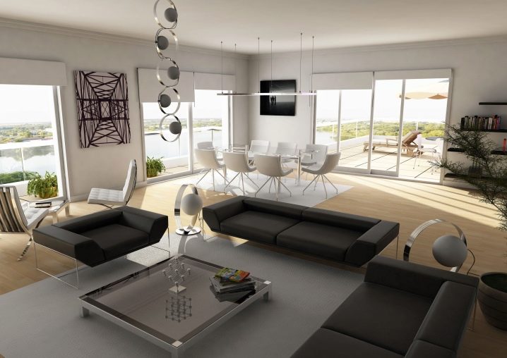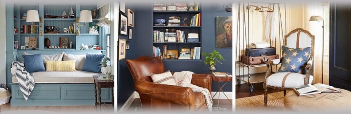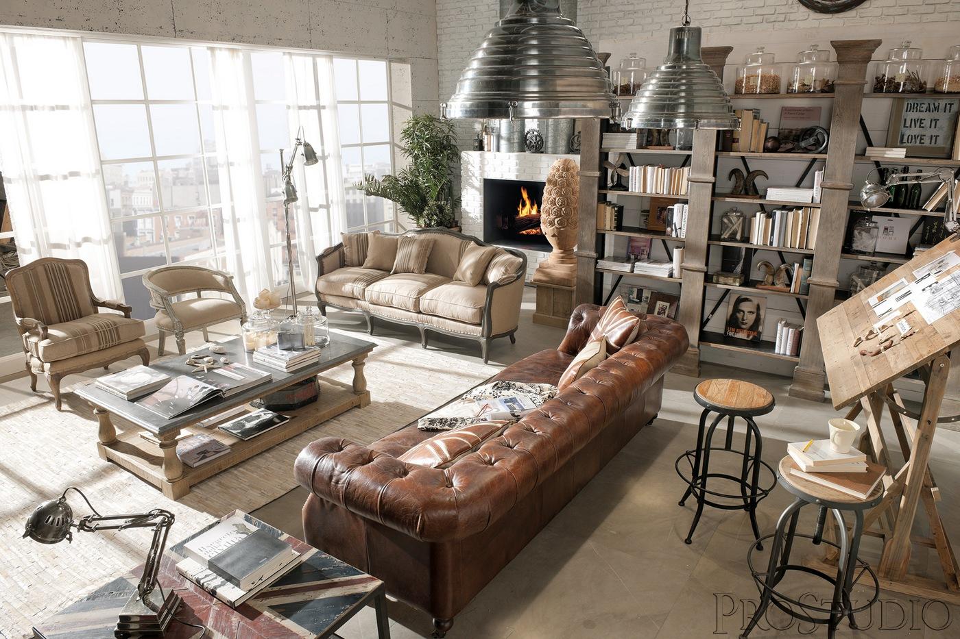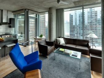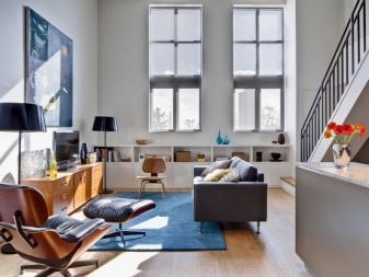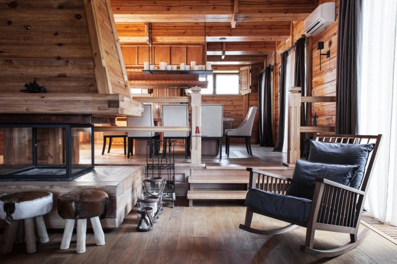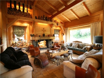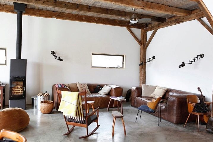 - Für modernen Stil Es ist charakteristisch, sowohl klassische als auch moderne Möbel zu verwenden. Es sieht gut aus, modernes Sofa, aus Leder und Holz, und machte "antike" Schaukelstühle als Alternative zum üblichen.