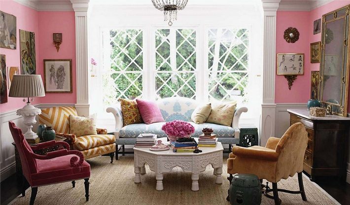 - Für den Stil von "Boho"im Gegenteil, verschiedene Kombinationen sind willkommen. Gleich ist es, eine Sache zu belassen: entweder Farbe oder Textur oder Stil. Gemischter Stil erfordert die Wahl von diskreten, aber hellen Farben.
