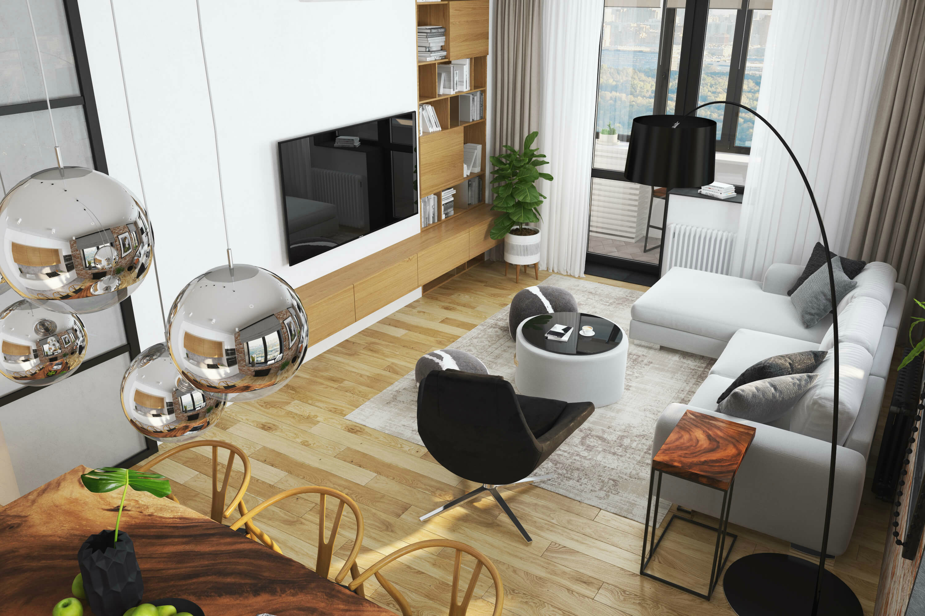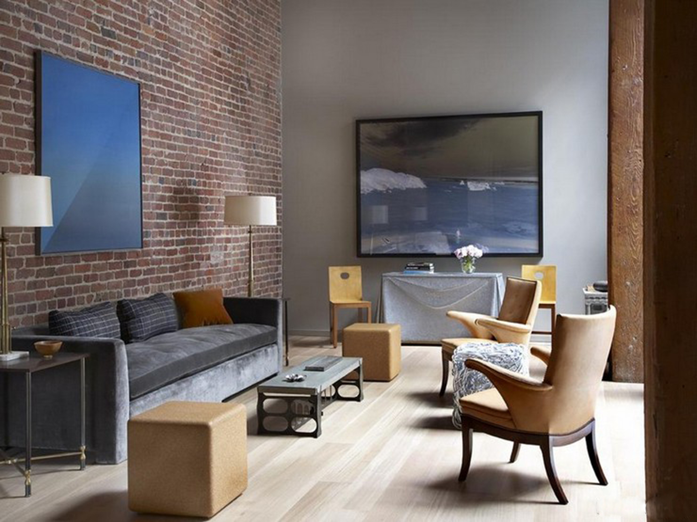 Ein komfortables Ecksofa aus neutralgrauem Stoff wird durch einen modernen beigefarbenen Ledersessel ergänzt. Hier ist alles anders: der Stil, das Material und die Farbe, aber dieses Loft-Wohnzimmer sieht wie eine einzige Komposition aus. Ein verbindendes Element für Möbel ist die Umgebung, an der sich der Designer orientiert und ein Set zusammenstellt.