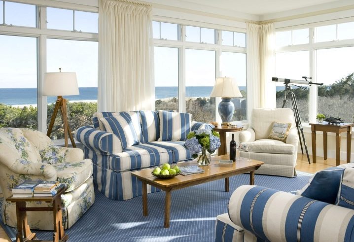 - Landhausstil begrüßt die Verwendung von verschiedenen Ornamenten in der Polsterung von Möbeln. Normalerweise kombinieren Sie einen Streifen, einen Käfig, gestrickte Muster. Kits werden normalerweise aus bewusst einfachen Elementen zusammengesetzt, aber aus umweltfreundlichen Materialien hergestellt. Der entscheidende Faktor ist der Komfort: Je wohnlicher das Kit aussieht, desto besser.