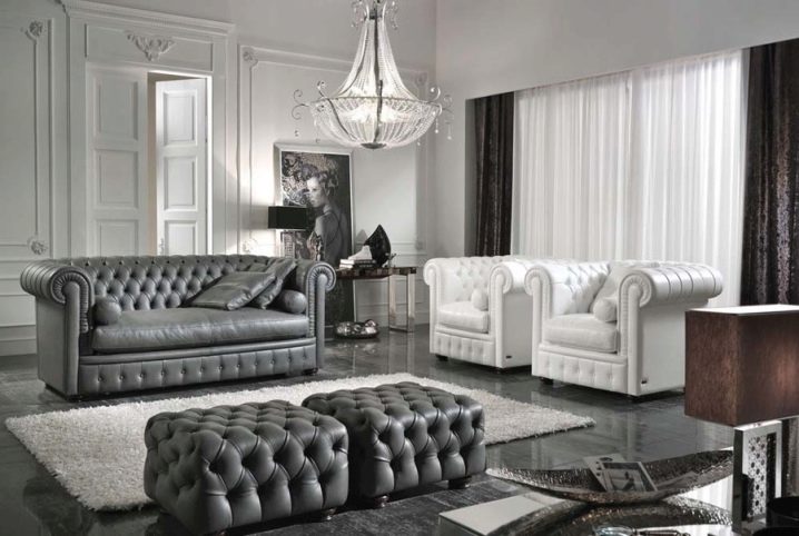 Einzelne Sets eignen sich zum Dekorieren von Räumen in traditionellen Stilen. Sehr oft finden Sie helle Farben und natürliche Materialien, ob Leder oder Stoff, im klassischen Stil der Wohnzimmer. Für sie werden das Sofa und die Sessel im gleichen Ensemble gekauft, und der Rest der Möbel wird mit der gleichen Berechnung ausgewählt.