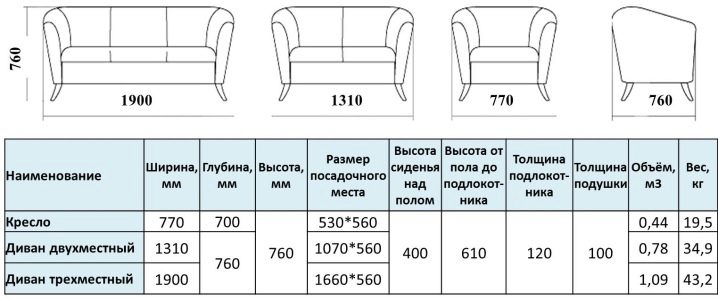 Standardgrößen von Sofas und Sesseln variieren. Die beste Wahl ist heute als Drei-Sitzer-Sofa anerkannt. Viele sagen, dass seine eine ist in der Regel genug Platz für alle Anwesenden im Raum, vor allem, wenn die Besitzer selten Gäste und ihre Familie selbst ist klein. Die Breite solcher Varianten beträgt gewöhnlich 1910 mm, die Tiefe - 900 mm.