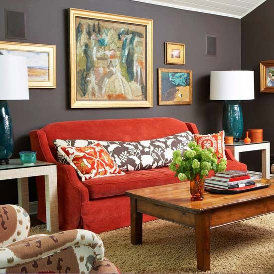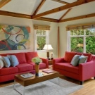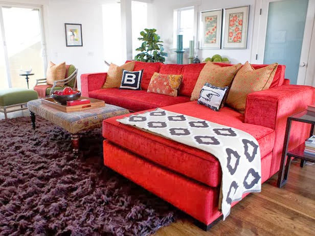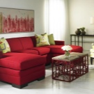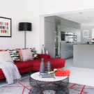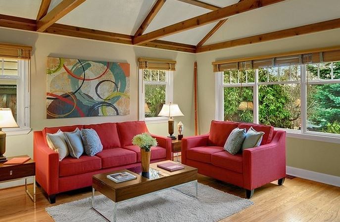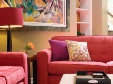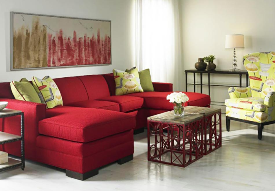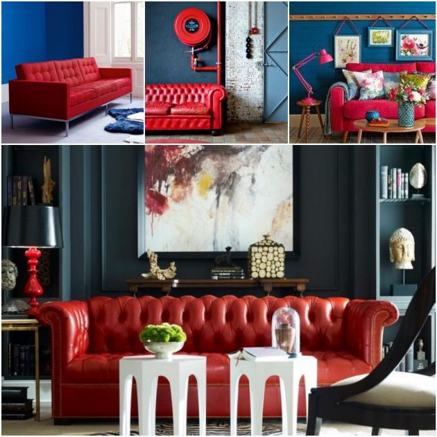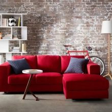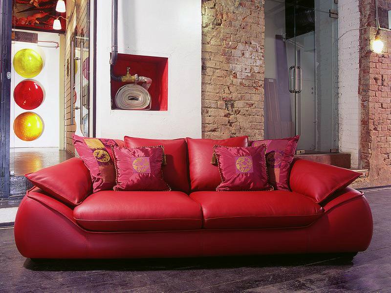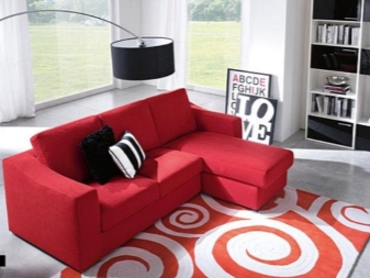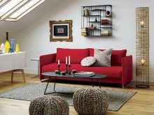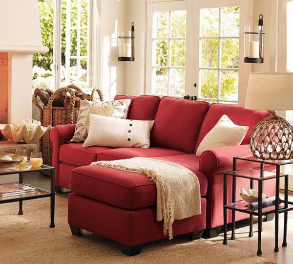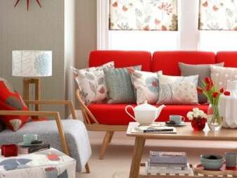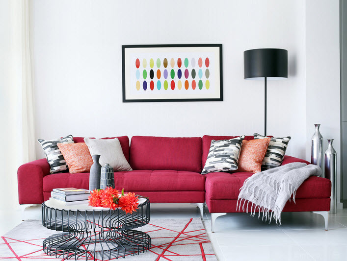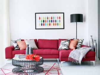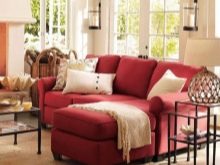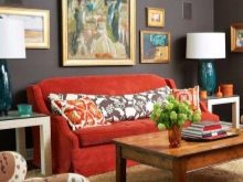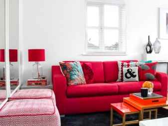 Red Sofa kann in einer Vielzahl von Räumen installiert werden, es gibt keine Hindernisse für solche Möbel, zum Beispiel im Wohnzimmer oder Esszimmer. Die Hauptsache - die richtige Kombination und kein Schnickschnack.