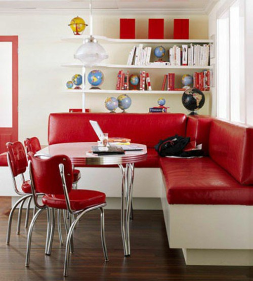 - Um die rote Farbe weicher zu machen, ist eine zusätzliche "starke" Farbe geeignet. Er verdünnt erfolgreich das Innere. Aber es lohnt sich, vorsichtig zu sein, um nicht zu zerbrechen. Es ist besser, solche Töne wie Schokolade, Purpur, Grau zu wählen. Blau-rotes Sofa schmückt den Essbereich perfekt. Helle Polsterung betonte Pastellfarben. Der Boden mit Imitation von hellem Holz wird den Kontrast abschwächen, und der Raum wird komfortabler, besonders wenn Sie ihm eine gelbe Farbe hinzufügen.