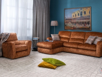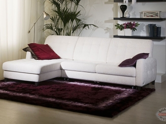 - Der Vorteil von Ecksofas ist ihre ungewöhnliche Form, die es ermöglicht, ein bestimmtes "Stück" des Raumes zu trennen, ohne den kostbaren Raum zu erfassen. Zusätzlich zu der banalen Position in der Ecke des Raumes ist dieses Produkt der Platzierung in der Mitte des Wohnzimmers nicht fremd;