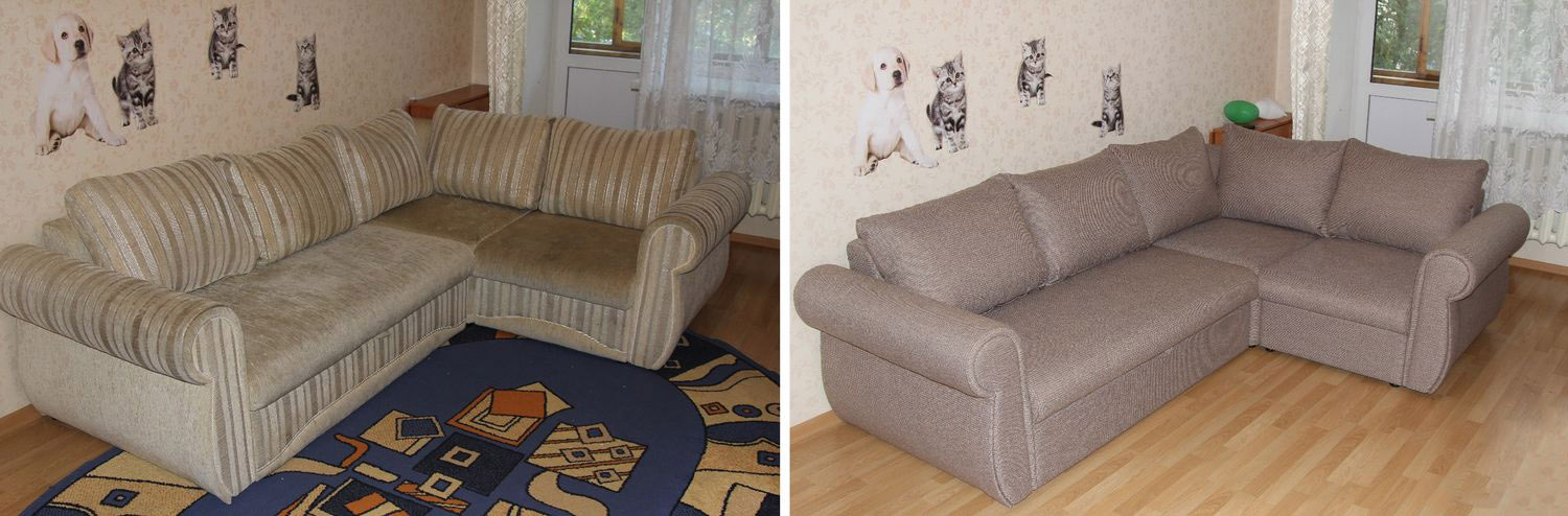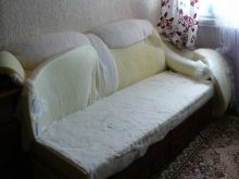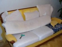 Das zweite Merkmal ist, dass, wenn die Möbel zu alt sind und nicht nur das Polstergewebe selbst abgenutzt ist, es notwendig sein wird, nicht nur das Material, sondern auch teilweise das Füllmaterial in den Möbeln und möglicherweise einige Teile des Rahmens zu ersetzen.