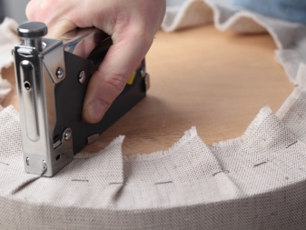 - Nachdem die Polsterung durch sie ersetzt wurde, können Sie fortfahren direktes Nachziehen des Rahmens das Sofa selbst. Der Stoff wird mit Nadeln und Faden an den abnehmbaren Teilen befestigt und mit Hilfe eines Hefters am Rahmen befestigt. Sie können eine Standardklebepistole verwenden.
