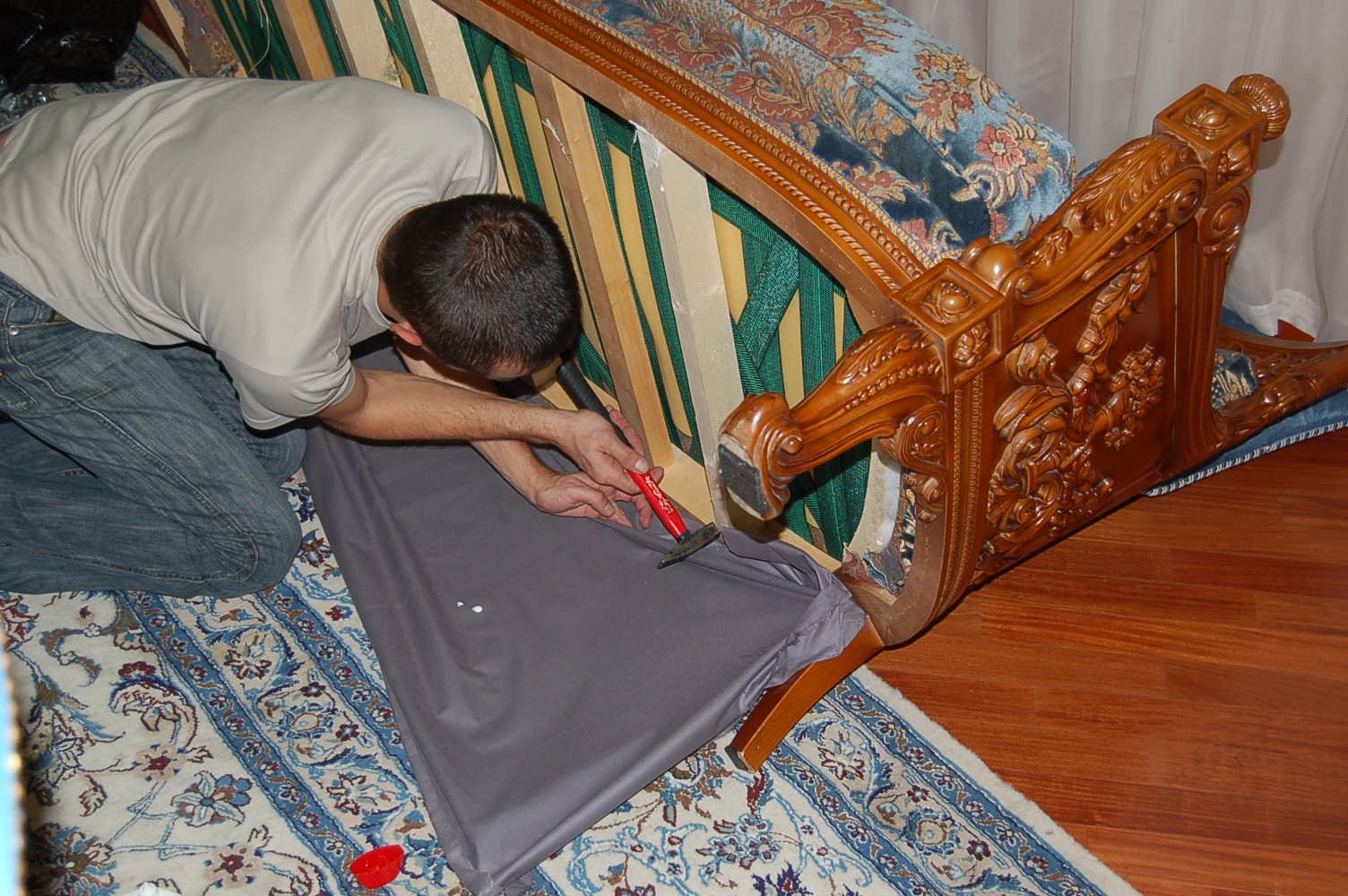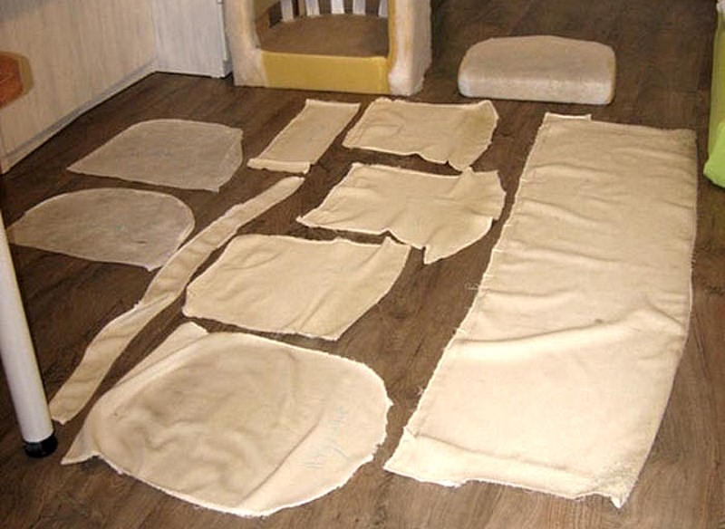 - Jetzt ist es notwendig Teile schneiden direkt am Sofa befestigen. Diese Arbeit sollte schrittweise und sorgfältig durchgeführt werden. Das Material selbst muss möglichst gleichmäßig gestreckt werden, damit das Muster nicht schielt und das Sofa so aussieht wie neu. Es ist am besten, von der Rückseite, den Seitenwänden und den Sitzen des Sofas zu ziehen.