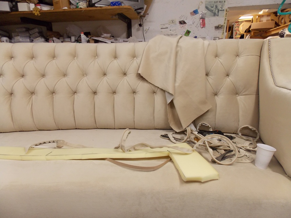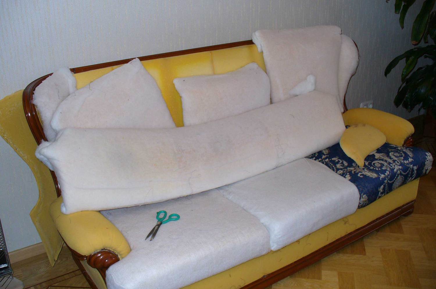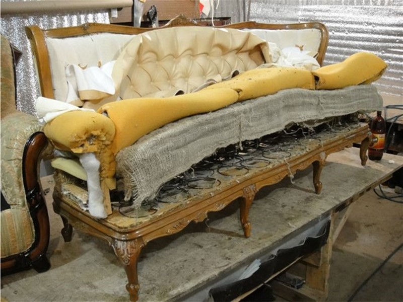- Dann entfernen wir alle Füllung von ihnen und auch mit dem Material auf dem Rahmen des Sofas selbst.
