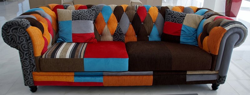 - Da das Material der Polsterung besser zu wählen ist dichter Stoff mit einem kleinen Muster ohne große und voluminöse Drucke. Dies spart Material, da es seine Teile aufgrund einer Nichtübereinstimmung des Musters nicht zurücklehnt. Darüber hinaus werden solche Sofas, wie die Praxis zeigt, weniger schmutzig und behalten während des Betriebs ihr Aussehen besser bei.