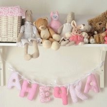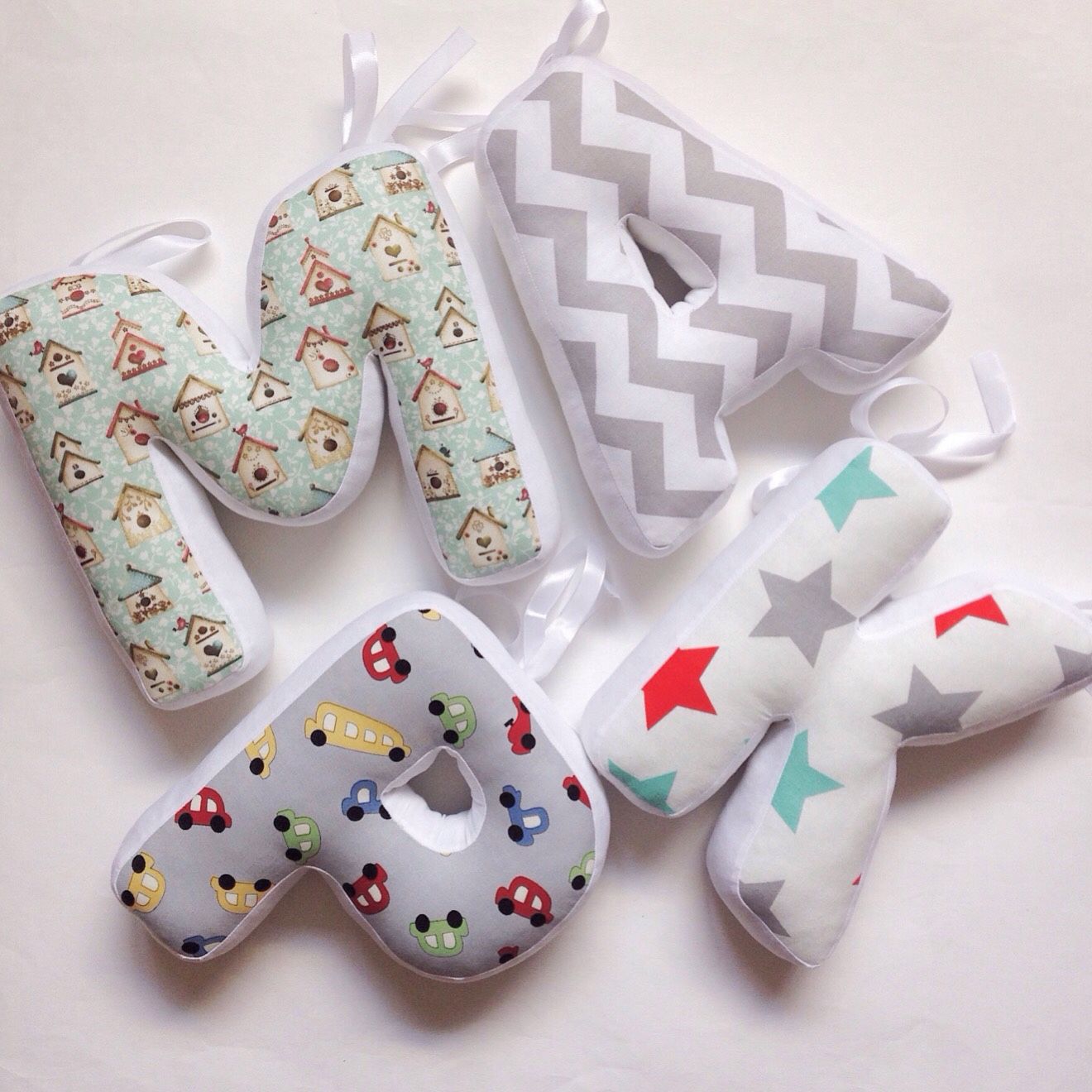 Ein sehr originelles Dekor wird die Schaffung von Kissen in Form von Buchstaben sein. Diese Option wäre ein tolles Geschenk für ein Kind. Buchstaben können schön in einer Krippe angeordnet oder in Form einer Girlande aufgehängt werden. Buchstaben-Kissen sind im Bild von Kissen-Wolken gemacht. Wenn Sie einen volumetrischen Buchstaben erstellen möchten, müssen Sie zusätzlich die Seite ausschneiden. Um dies zu tun, müssen Sie die Länge des Umfangs der Buchstaben bestimmen und die Nahtzugabe machen - etwa zwei Zentimeter.