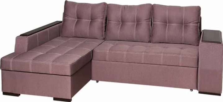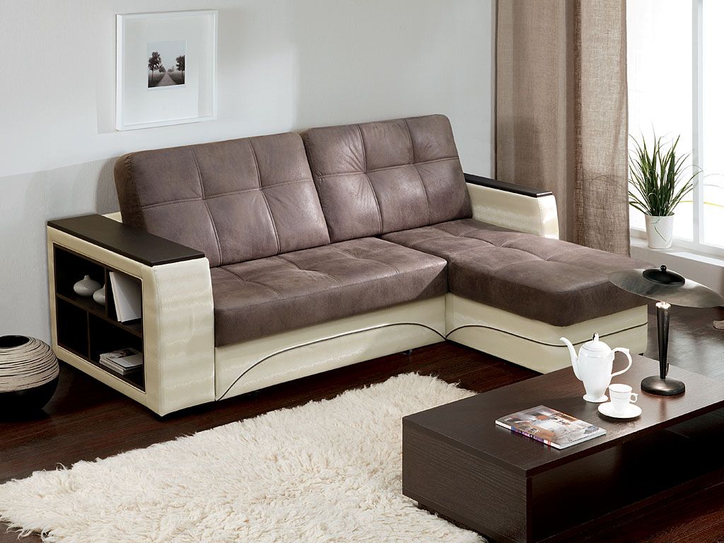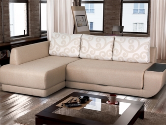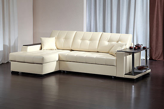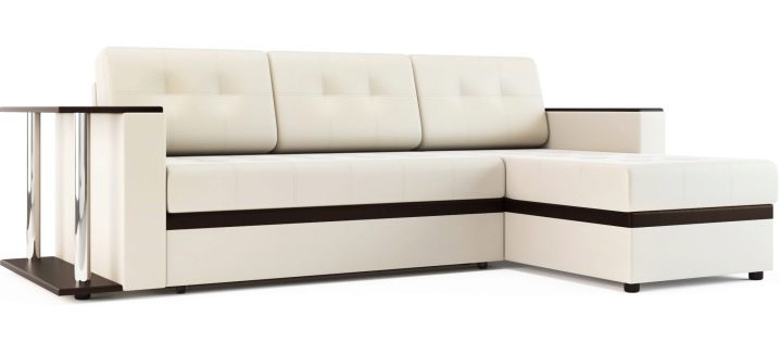 - Ein interessantes Modell eines preiswerten Ecksofa ist "Atlanta. Die Maße betragen im zusammengebauten Zustand 245x85x154 cm, im ausgeklappten Zustand können Sie einen Schlafplatz von 200x143 cm erhalten.Dieses Design hat einen Universalwinkel, dessen Position direkt während der Montage ausgewählt wird. Der Rahmen besteht aus einer Kombination von Holz, Sperrholz und laminierter Spanplatte. Der Sitzfüller ist Polyurethanschaum. Polster werden meistens als Kunstleder verwendet, aber Sie können auch eine Version des Stoffes bestellen. Im Eckfach des Sofas befindet sich eine Wäschebox, die mit einem Gaslift ausgestattet ist.Ein interessantes Merkmal des Designs ist ein Couchtisch, der an der Stelle einer der Armlehnen mit zwei Ebenen von Regalen ausgestattet ist.