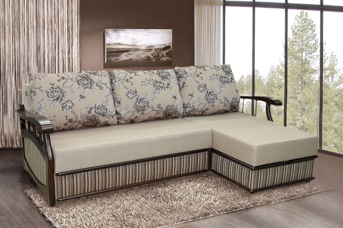 - Ein interessantes Modell eines geraden Sofas mit einem Delfinmechanismus, der genannt wird "Venedig". Ein elegantes 2-Sitzer-Sofa im Art Deco-Stil hat eine Größe von 235x85 cm und bildet bei der Gestaltung ein Bett von 195x156 cm.Der Sitzfüller ist PPU (Möbelschaumgummi), die Kissen sind mit Moosgummi und Hollow Fiber gefüllt, die weichen geschwungenen Armlehnen und die Unterseite der Schlafplattform sind mit MDF-Raten dekoriert. Die Polsterung des Sofas "Venice" kann aus neun Arten und Farben des Gewebes gemacht werden, es ist möglich, in Kombination von zwei oder drei Materialoptionen zu arbeiten. In diesem Modell gibt es keine Aufbewahrungsbox für Bettwäsche, aber fünf kleine dekorative Kissen werden angeboten. Es ist möglich, ein Sofa "Venedig" für die Summe von 19 000 Rubel zu kaufen. (Kosten hängen von der Wahl der Materialpolsterung ab).
