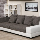 Dieses gemütliche Sofa ist im modernen Stil gemacht. Tapisserie und Kunstlederpolsterung ist langlebig und resistent gegen Schmutz. Besonderes Augenmerk wird auf die breiten Armlehnen aus Holz gelegt, die als Minitische genutzt werden können.