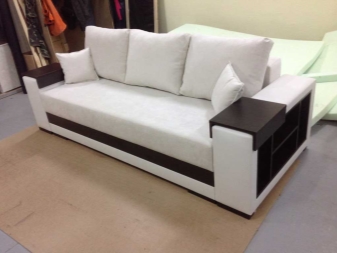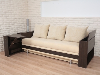 In einigen Fällen werden die üblichen Armlehnen durch Mini-Holztische ersetzt. Solche Modelle werden im Wohnzimmer gut aussehen. Manchmal sind diese Abdeckungen faltbar, und unter ihnen sind Nischen zur Aufbewahrung von Bettwäsche angeordnet. Es lohnt sich, solchen Modellen Beachtung zu schenken, da zusätzliche Aufbewahrungsboxen im täglichen Leben immer nützlich sein werden.