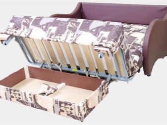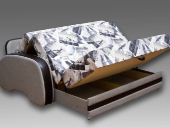 Dieses moderne Design kombiniert die beiden oben beschriebenen Modelle. Sie müssen zuerst die Armlehnen einstellen und dann den Sitz senken. Es gibt eine geräumige Schublade für die Lagerung von Bettwäsche. Die Rückenlehne und die Armlehnen können verschiedene Positionen einnehmen, um maximalen Komfort zu bieten. Aber die Transformation des Sofas findet in mehreren Etappen statt und erfordert Anstrengung.Auf täglicher Basis können diese Maßnahmen lästig sein.